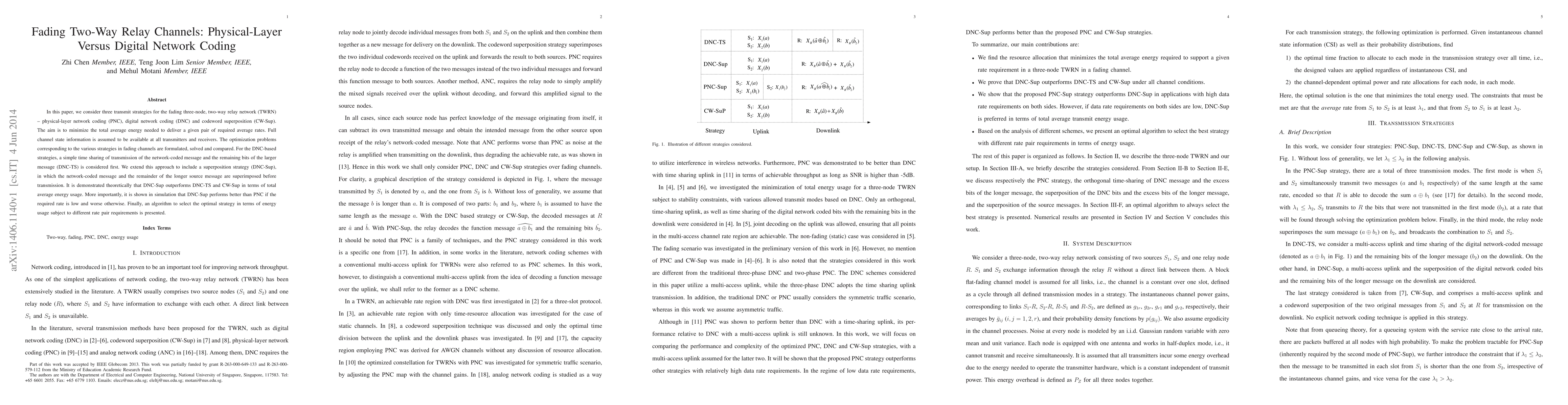 In this paper, we consider three transmit strategies for the fading three-node, two-way relay network (TWRN) -- physical-layer network coding (PNC), digital network coding (DNC) and codeword superposition (CW-Sup). The aim is to minimize the total average energy needed to deliver a given pair of required average rates. Full channel state information is assumed to be available at all transmitters and receivers. The optimization problems corresponding to the various strategies in fading channels are formulated, solved and compared. For the DNC-based strategies, a simple time sharing of transmission of the network-coded message and the remaining bits of the larger message (DNC-TS) is considered first. We extend this approach to include a superposition strategy (DNC-Sup), in which the network-coded message and the remainder of the longer source message are superimposed before transmission. It is demonstrated theoretically that DNC-Sup outperforms DNC-TS and CW-Sup in terms of total average energy usage. More importantly, it is shown in simulation that DNC-Sup performs better than PNC if the required rate is low and worse otherwise. Finally, an algorithm to select the optimal strategy in terms of energy usage subject to different rate pair requirements is presented.