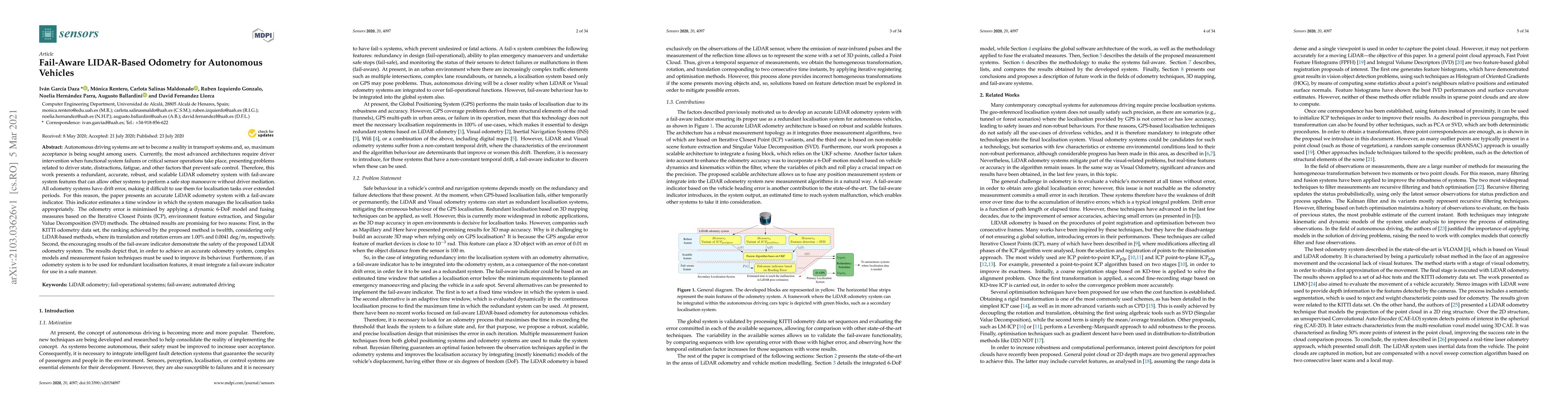 Autonomous driving systems are set to become a reality in transport systems and, so, maximum acceptance is being sought among users. Currently, the most advanced architectures require driver intervention when functional system failures or critical sensor operations take place, presenting problems related to driver state, distractions, fatigue, and other factors that prevent safe control. Therefore, this work presents a redundant, accurate, robust, and scalable LiDAR odometry system with fail-aware system features that can allow other systems to perform a safe stop manoeuvre without driver mediation. All odometry systems have drift error, making it difficult to use them for localisation tasks over extended periods. For this reason, the paper presents an accurate LiDAR odometry system with a fail-aware indicator. This indicator estimates a time window in which the system manages the localisation tasks appropriately. The odometry error is minimised by applying a dynamic 6-DoF model and fusing measures based on the Iterative Closest Points (ICP), environment feature extraction, and Singular Value Decomposition (SVD) methods. The obtained results are promising for two reasons: First, in the KITTI odometry data set, the ranking achieved by the proposed method is twelfth, considering only LiDAR-based methods, where its translation and rotation errors are 1.00% and 0.0041 deg/m, respectively. Second, the encouraging results of the fail-aware indicator demonstrate the safety of the proposed LiDAR odometry system. The results depict that, in order to achieve an accurate odometry system, complex models and measurement fusion techniques must be used to improve its behaviour. Furthermore, if an odometry system is to be used for redundant localisation features, it must integrate a fail-aware indicator for use in a safe manner.