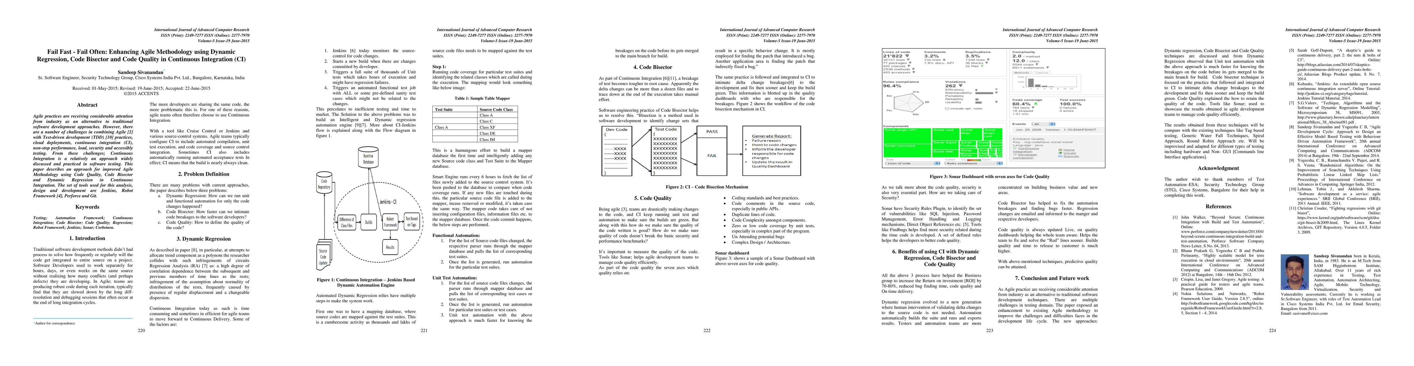 This paper proposes an enhanced Agile methodology integrating dynamic regression, code bisector, and code quality within continuous integration (CI) to address challenges in Agile practices, including testing for performance, load, security, and accessibility. Tools like Jenkins, Robot Framework, Perforce, and Git are utilized to implement this approach.