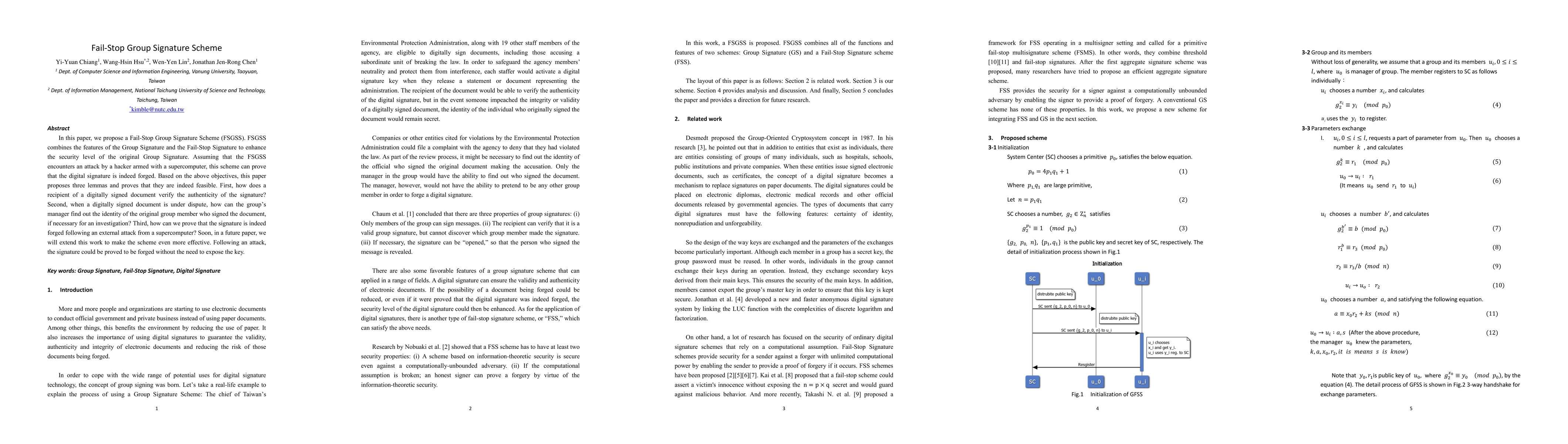 In this paper, we propose a Fail-Stop Group Signature Scheme (FSGSS). FSGSS combines the features of the Group Signature and the Fail-Stop Signature to enhance the security level of the original Group Signature. Assuming that the FSGSS encounters an attack by a hacker armed with a supercomputer, this scheme can prove that the digital signature is indeed forged. Based on the above objectives, this paper proposes three lemmas and proves that they are indeed feasible. First, how does a recipient of a digitally signed document verify the authenticity of the signature? Second, when a digitally signed document is under dispute, how can the group's manager find out the identity of the original group member who signed the document, if necessary for an investigation? Third, how can we prove that the signature is indeed forged following an external attack from a supercomputer? Soon, in a future paper, we will extend this work to make the scheme even more effective. Following an attack, the signature could be proved to be forged without the need to expose the key.