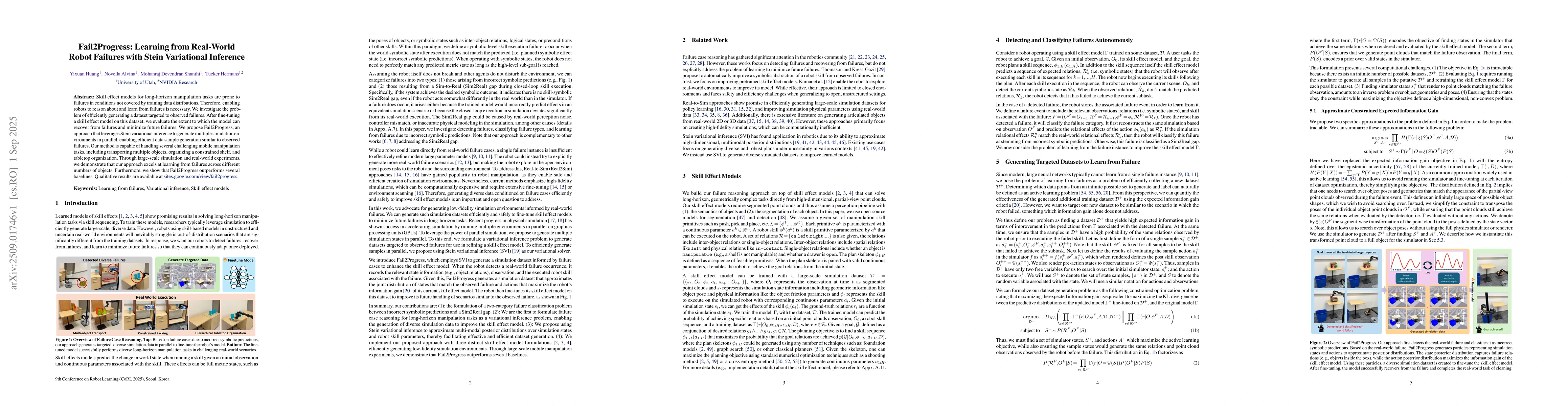 Skill effect models for long-horizon manipulation tasks are prone to failures in conditions not covered by training data distributions. Therefore, enabling robots to reason about and learn from failures is necessary. We investigate the problem of efficiently generating a dataset targeted to observed failures. After fine-tuning a skill effect model on this dataset, we evaluate the extent to which the model can recover from failures and minimize future failures. We propose Fail2Progress, an approach that leverages Stein variational inference to generate multiple simulation environments in parallel, enabling efficient data sample generation similar to observed failures. Our method is capable of handling several challenging mobile manipulation tasks, including transporting multiple objects, organizing a constrained shelf, and tabletop organization. Through large-scale simulation and real-world experiments, we demonstrate that our approach excels at learning from failures across different numbers of objects. Furthermore, we show that Fail2Progress outperforms several baselines.