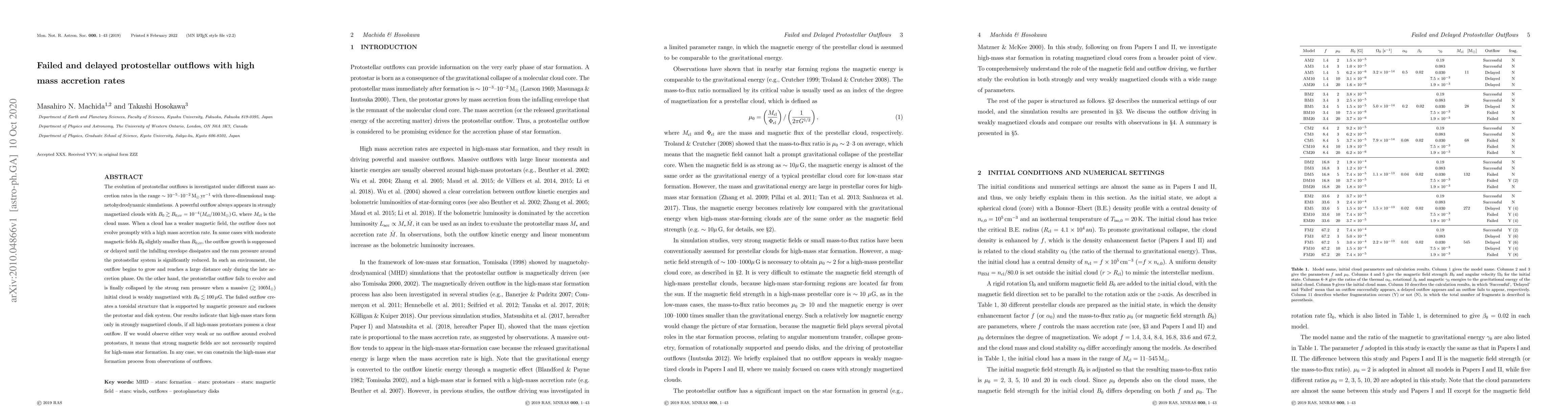 The evolution of protostellar outflows is investigated under different mass accretion rates in the range $\sim10^{-5}-10^{-2} {\rm M}_\odot$ yr$^{-1}$ with three-dimensional magnetohydrodynamic simulations. A powerful outflow always appears in strongly magnetized clouds with $B_0 \gtrsim B_{\rm 0, cr}$ $=10^{-4} (M_{\rm cl}/100 {\rm M}_\odot){\rm G}$, where $M_{\rm cl}$ is the cloud mass. When a cloud has a weaker magnetic field, the outflow does not evolve promptly with a high mass accretion rate. In some cases with moderate magnetic fields $B_0$ slightly smaller than $B_{\rm 0,cr}$, the outflow growth is suppressed or delayed until the infalling envelope dissipates and the ram pressure around the protostellar system is significantly reduced. In such an environment, the outflow begins to grow and reaches a large distance only during the late accretion phase. On the other hand, the protostellar outflow fails to evolve and is finally collapsed by the strong ram pressure when a massive $(\gtrsim 100 {\rm M}_\odot)$ initial cloud is weakly magnetized with $B_0 \lesssim 100 \mu {\rm G}$. The failed outflow creates a toroidal structure that is supported by magnetic pressure and encloses the protostar and disk system. Our results indicate that high-mass stars form only in strongly magnetized clouds, if all high-mass protostars possess a clear outflow. If we would observe either very weak or no outflow around evolved protostars, it means that strong magnetic fields are not necessarily required for high-mass star formation. In any case, we can constrain the high-mass star formation process from observations of outflows.