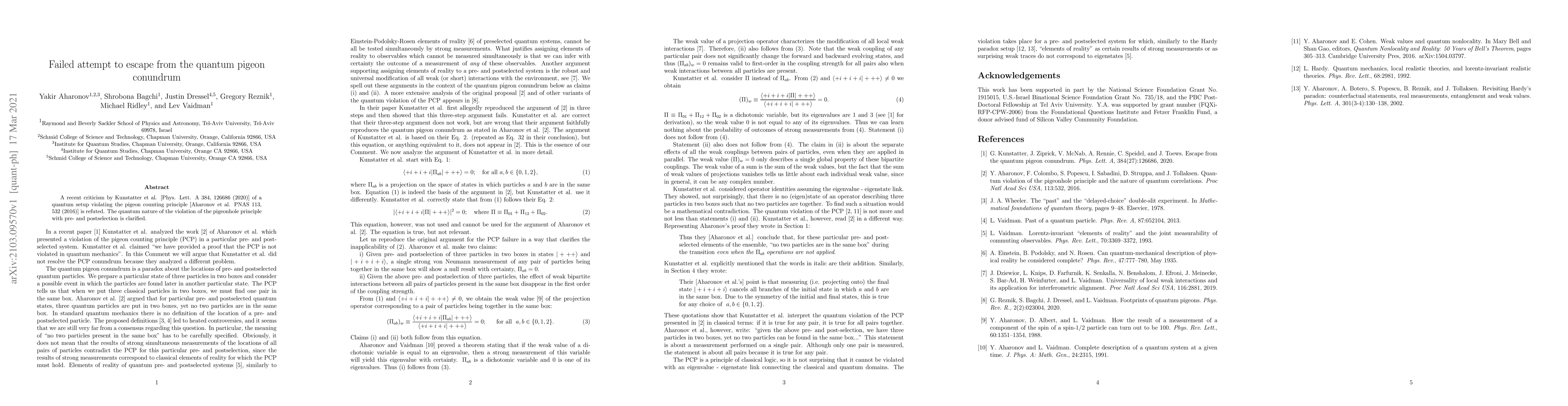 A recent criticism by Kunstatter et al. [Phys. Lett. A 384, 126686 (2020)] of a quantum setup violating the pigeon counting principle [Aharonov et al. PNAS 113, 532 (2016)] is refuted. The quantum nature of the violation of the pigeonhole principle with pre- and postselection is clarified.