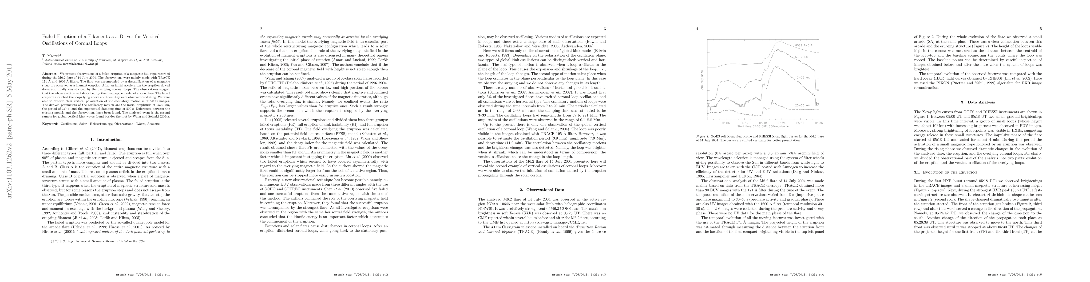 The paper presents observations of a failed solar eruption in 2004, which stretched and caused vertical oscillations in overlying coronal loops. The event was captured by TRACE 171 Å and 1600 Å filters, revealing an initial acceleration followed by containment. The oscillations had an amplitude of 9520 km, a period of 377 s, and an exponential damping time of 500 s. This event supports the quadrupole model and adds to the limited samples of global vertical kink waves.