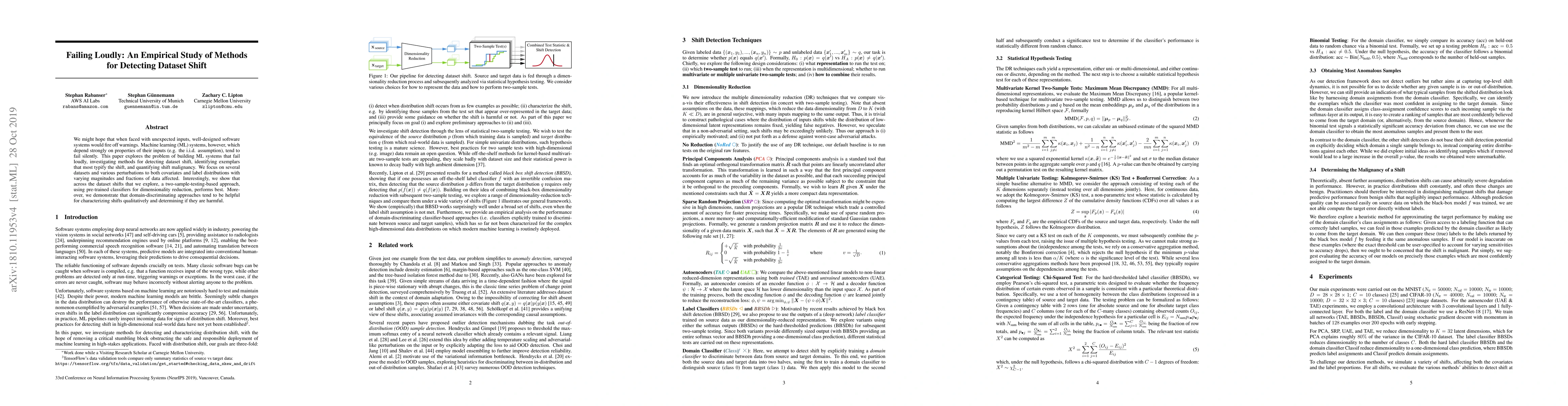 We might hope that when faced with unexpected inputs, well-designed software systems would fire off warnings. Machine learning (ML) systems, however, which depend strongly on properties of their inputs (e.g. the i.i.d. assumption), tend to fail silently. This paper explores the problem of building ML systems that fail loudly, investigating methods for detecting dataset shift, identifying exemplars that most typify the shift, and quantifying shift malignancy. We focus on several datasets and various perturbations to both covariates and label distributions with varying magnitudes and fractions of data affected. Interestingly, we show that across the dataset shifts that we explore, a two-sample-testing-based approach, using pre-trained classifiers for dimensionality reduction, performs best. Moreover, we demonstrate that domain-discriminating approaches tend to be helpful for characterizing shifts qualitatively and determining if they are harmful.