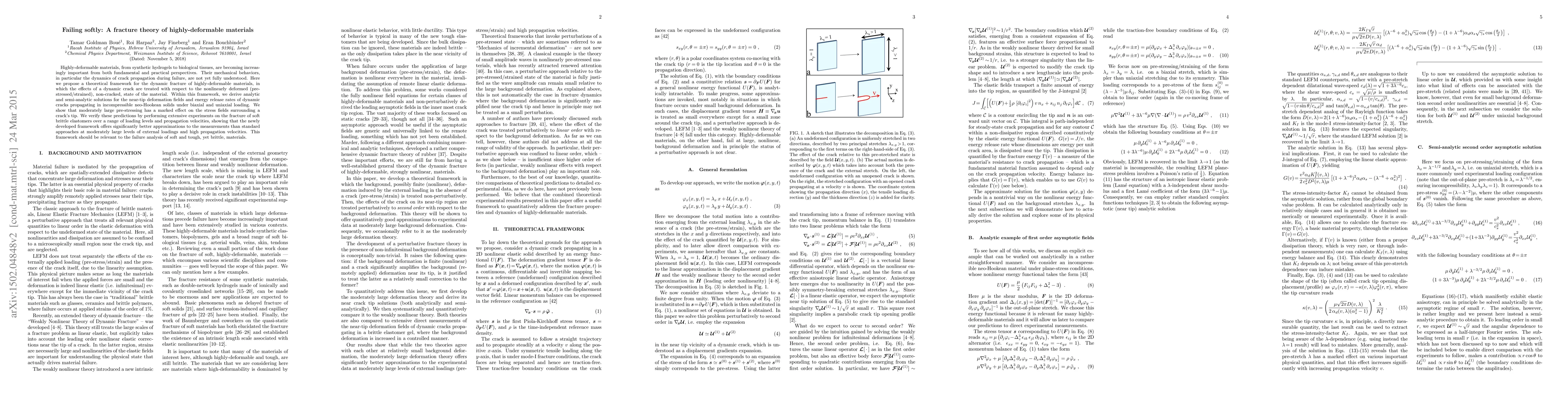 This paper proposes a theoretical framework for understanding the dynamic fracture of highly-deformable materials, deriving solutions for crack propagation in pre-stressed incompressible solids. Experimental validation shows the framework provides better approximations than standard methods under high loading and propagation velocities.
