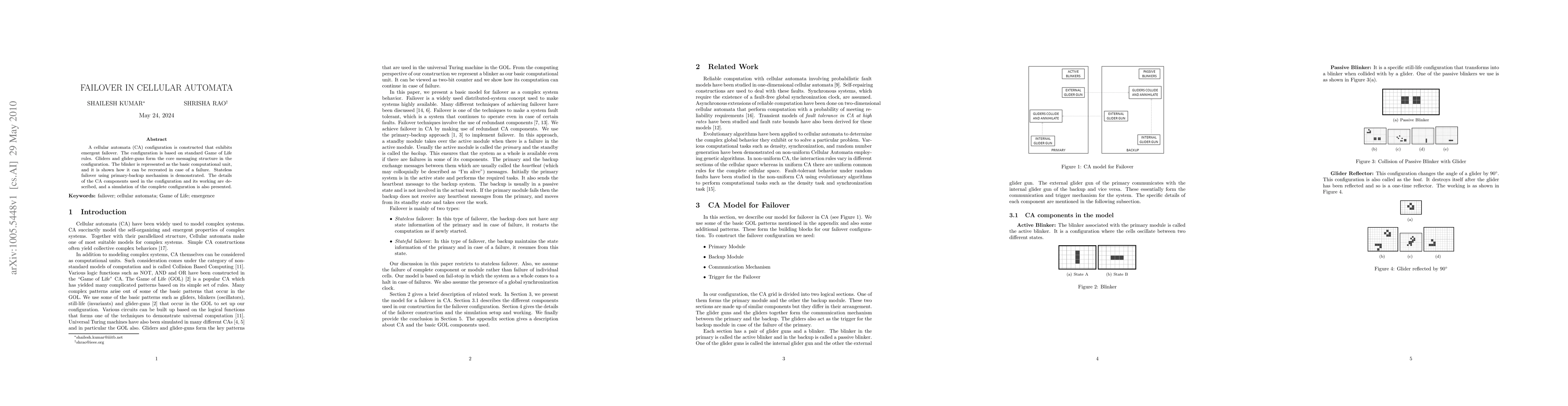 A cellular automata configuration demonstrates emergent failover using Game of Life rules, showcasing a primary-backup mechanism for stateless failover.