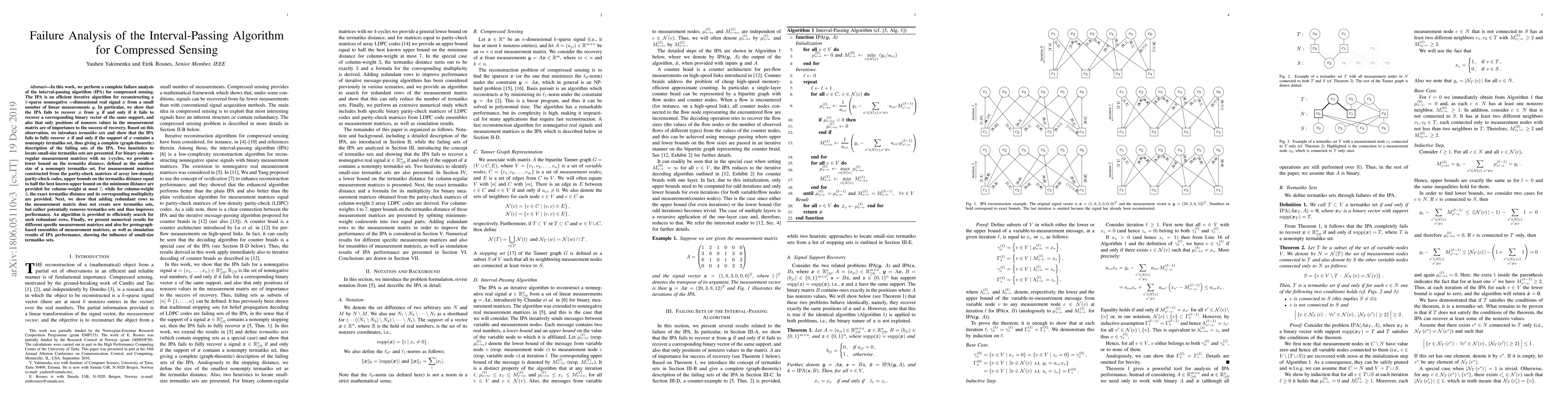 This paper analyzes the failure conditions of the interval-passing algorithm (IPA) for compressed sensing, identifying that IPA fails when the support of the signal contains a nonempty termatiko set. The study provides heuristics to locate these sets and presents bounds on their size for specific measurement matrices, showing that adding redundant rows can improve IPA performance by removing termatiko sets.