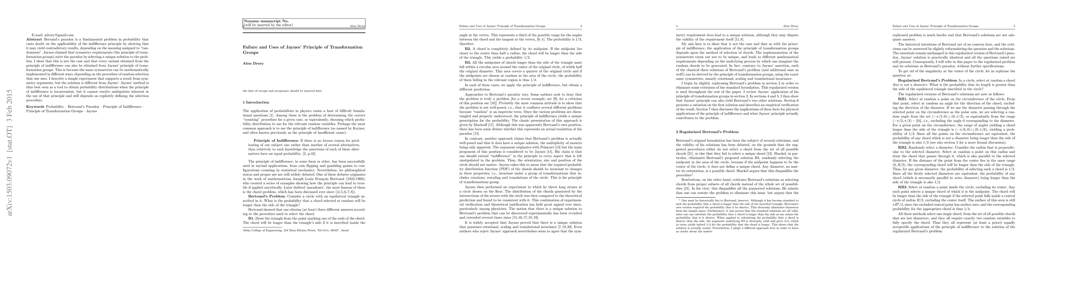 This paper argues that Jaynes' principle of transformation groups fails to resolve Bertrand's paradox and cannot uniquely determine probability distributions, as it can yield the same results as the principle of indifference. The author concludes that Jaynes' method is useful but does not eliminate ambiguities inherent in the principle of indifference.