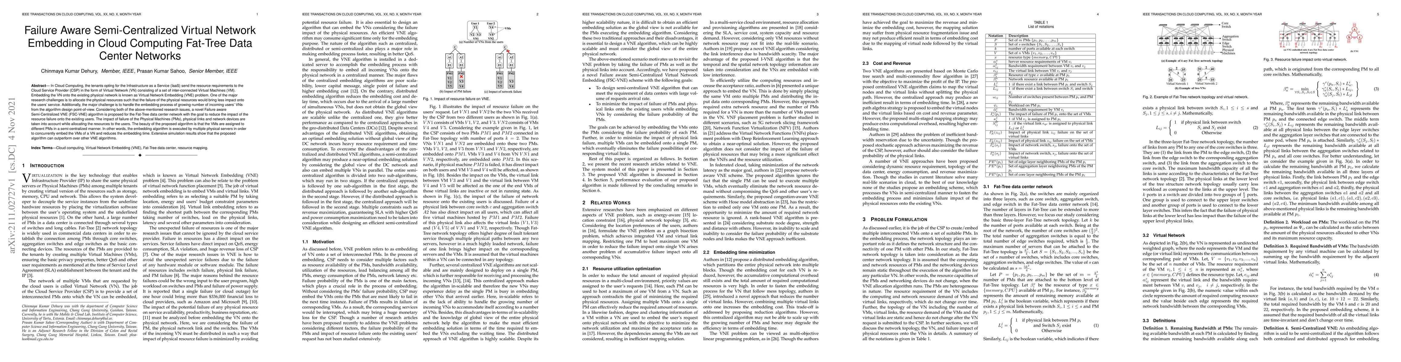 In Cloud Computing, the tenants opting for the Infrastructure as a Service (IaaS) send the resource requirements to the Cloud Service Provider (CSP) in the form of Virtual Network (VN) consisting of a set of inter-connected Virtual Machines (VM). Embedding the VN onto the existing physical network is known as Virtual Network Embedding (VNE) problem. One of the major research challenges is to allocate the physical resources such that the failure of the physical resources would bring less impact onto the users' service. Additionally, the major challenge is to handle the embedding process of growing number of incoming users' VNs from the algorithm design point-of-view. Considering both of the above-mentioned research issues, a novel Failure aware Semi-Centralized VNE (FSC-VNE) algorithm is proposed for the Fat-Tree data center network with the goal to reduce the impact of the resource failure onto the existing users. The impact of failure of the Physical Machines (PMs), physical links and network devices are taken into account while allocating the resources to the users. The beauty of the proposed algorithm is that the VMs are assigned to different PMs in a semi-centralized manner. In other words, the embedding algorithm is executed by multiple physical servers in order to concurrently embed the VMs of a VN and reduces the embedding time. Extensive simulation results show that the proposed algorithm can outperform over other VNE algorithms.