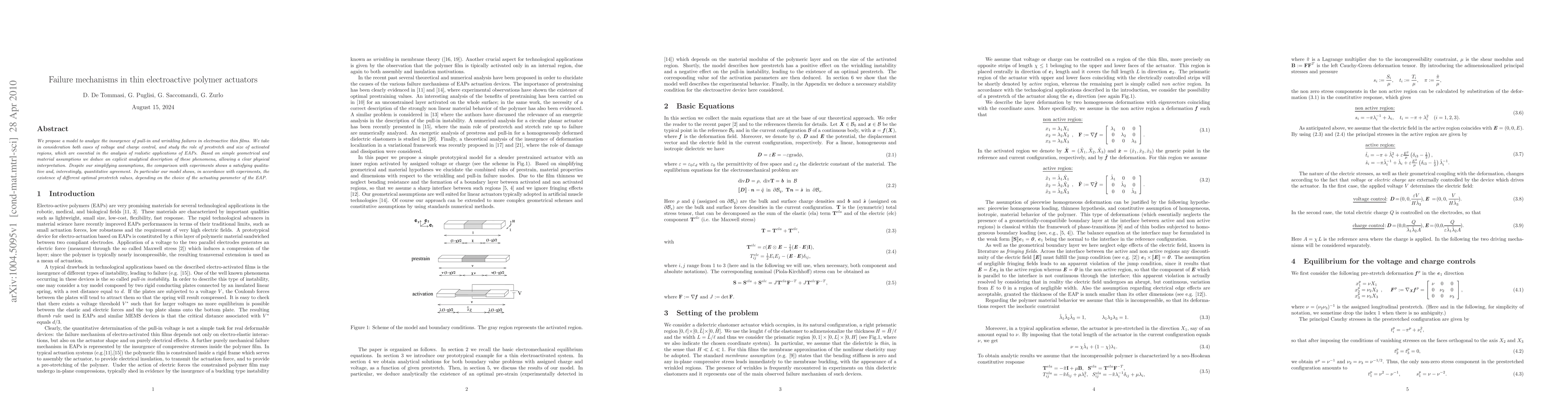We propose a model to analyze the insurgence of pull-in and wrinkling failures in electroactive thin films. We take in consideration both cases of voltage and charge control, and study the role of prestretch and size of activated regions, which are essential in the analysis of realistic applications of EAPs. Based on simple geometrical and material assumptions we deduce an explicit analytical description of these phenomena, allowing a clear physical interpretation. Despite our simplifying assumptions, the comparison with experiments shows a satisfying qualitative and, interestingly, quantitative agreement. In particular our model shows, in accordance with experiments, the existence of different optimal prestretch values, depending on the choice of the actuating parameter of the EAP.
