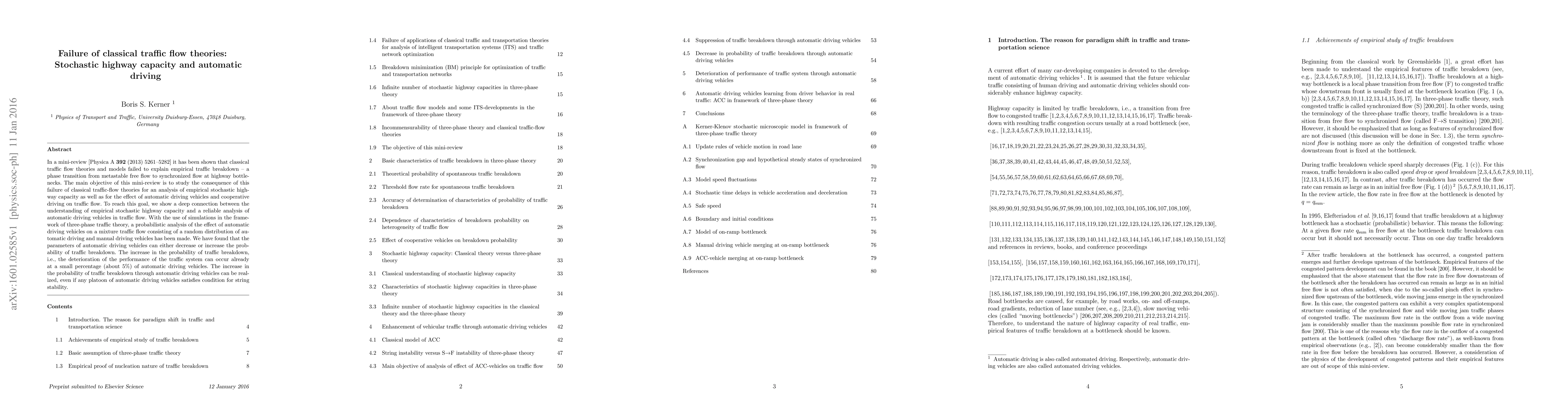 In a mini-review [Physica A {\bf 392} (2013) 5261--5282] it has been shown that classical traffic flow theories and models failed to explain empirical traffic breakdown -- a phase transition from metastable free flow to synchronized flow at highway bottlenecks. The main objective of this mini-review is to study the consequence of this failure of classical traffic-flow theories for an analysis of empirical stochastic highway capacity as well as for the effect of automatic driving vehicles and cooperative driving on traffic flow. To reach this goal, we show a deep connection between the understanding of empirical stochastic highway capacity and a reliable analysis of automatic driving vehicles in traffic flow. With the use of simulations in the framework of three-phase traffic theory, a probabilistic analysis of the effect of automatic driving vehicles on a mixture traffic flow consisting of a random distribution of automatic driving and manual driving vehicles has been made. We have found that the parameters of automatic driving vehicles can either decrease or increase the probability of traffic breakdown. The increase in the probability of traffic breakdown, i.e., the deterioration of the performance of the traffic system can occur already at a small percentage (about 5$\%$) of automatic driving vehicles. The increase in the probability of traffic breakdown through automatic driving vehicles can be realized, even if any platoon of automatic driving vehicles satisfies condition for string stability.
