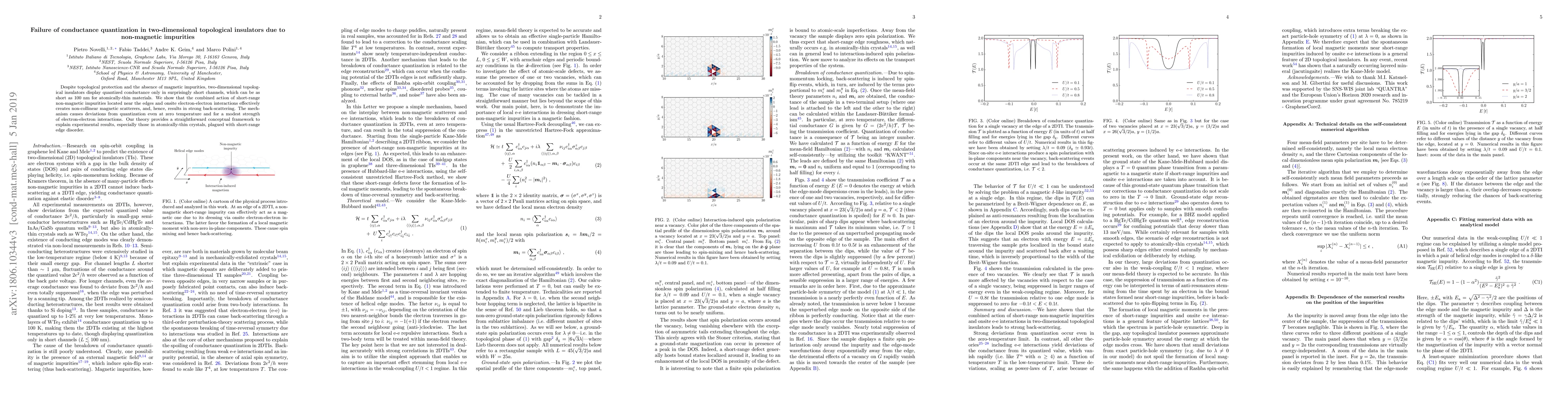 This paper explains why conductance quantization in two-dimensional topological insulators fails in short channels due to non-magnetic impurities. It demonstrates that nonmagnetic impurities and electron-electron interactions create noncollinear magnetic scatterers, leading to strong backscattering and deviations from conductance quantization, even at zero temperature.