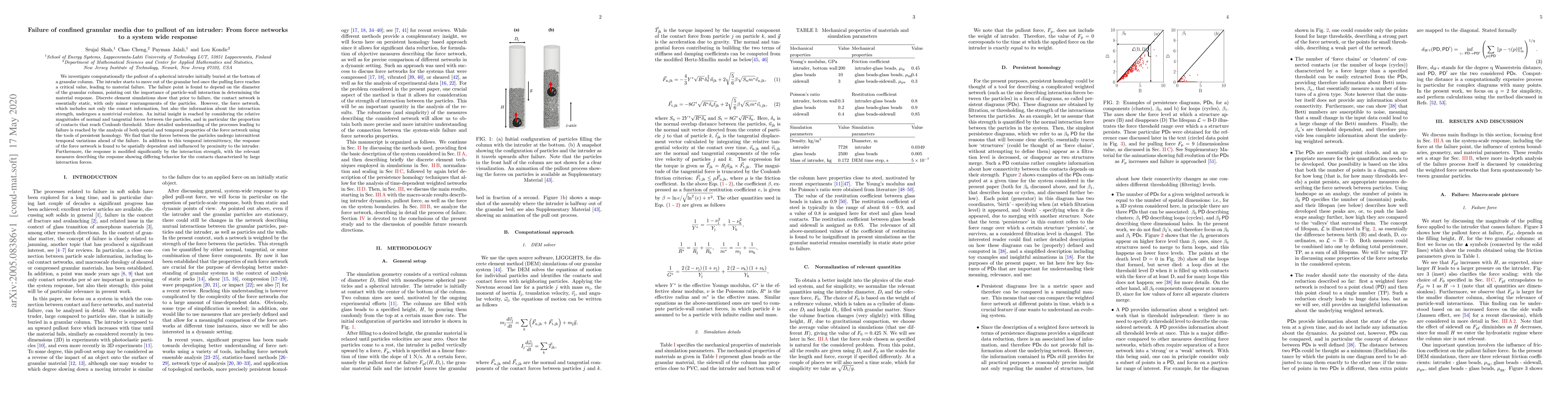 We investigate computationally the pullout of a spherical intruder initially buried at the bottom of a granular column. The intruder starts to move out of the granular bed once the pulling force reaches a critical value, leading to material failure. The failure point is found to depend on the diameter of the granular column, pointing out the importance of particle-wall interaction in determining the material response. Discrete element simulations show that prior to failure, the contact network is essentially static, with only minor rearrangements of the particles. However, the force network, which includes not only the contact information, but also the information about the interaction strength, undergoes a nontrivial evolution. An initial insight is reached by considering the relative magnitudes of normal and tangential forces between the particles, and in particular the proportion of contacts that reach Coulomb threshold. More detailed understanding of the processes leading to failure is reached by the analysis of both spatial and temporal properties of the force network using the tools of persistent homology. We find that the forces between the particles undergo intermittent temporal variations ahead of the failure. In addition to this temporal intermittency, the response of the force network is found to be spatially dependent and influenced by proximity to the intruder. Furthermore, the response is modified significantly by the interaction strength, with the relevant measures describing the response showing differing behavior for the contacts characterized by large interaction forces.