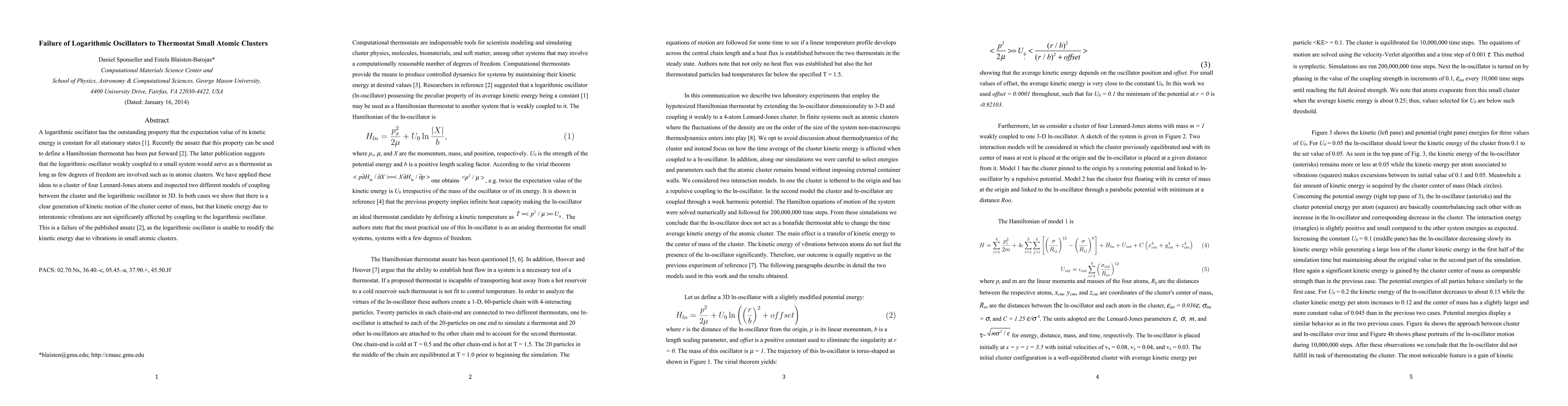 A logarithmic oscillator has the outstanding property that the expectation value of its kinetic energy is constant for all stationary states [1]. Recently the ansatz that this property can be used to define a Hamiltonian thermostat has been put forward [2]. The latter publication suggests that the logarithmic oscillator weakly coupled to a small system would serve as a thermostat as long as few degrees of freedom are involved such as in atomic clusters. We have applied these ideas to a cluster of four Lennard-Jones atoms and inspected two different models of coupling between the cluster and the logarithmic oscillator in 3D. In both cases we show that there is a clear generation of kinetic motion of the cluster center of mass, but that kinetic energy due to interatomic vibrations are not significantly affected by coupling to the logarithmic oscillator. This is a failure of the published ansatz [2], as the logarithmic oscillator is unable to modify the kinetic energy due to vibrations in small atomic clusters.