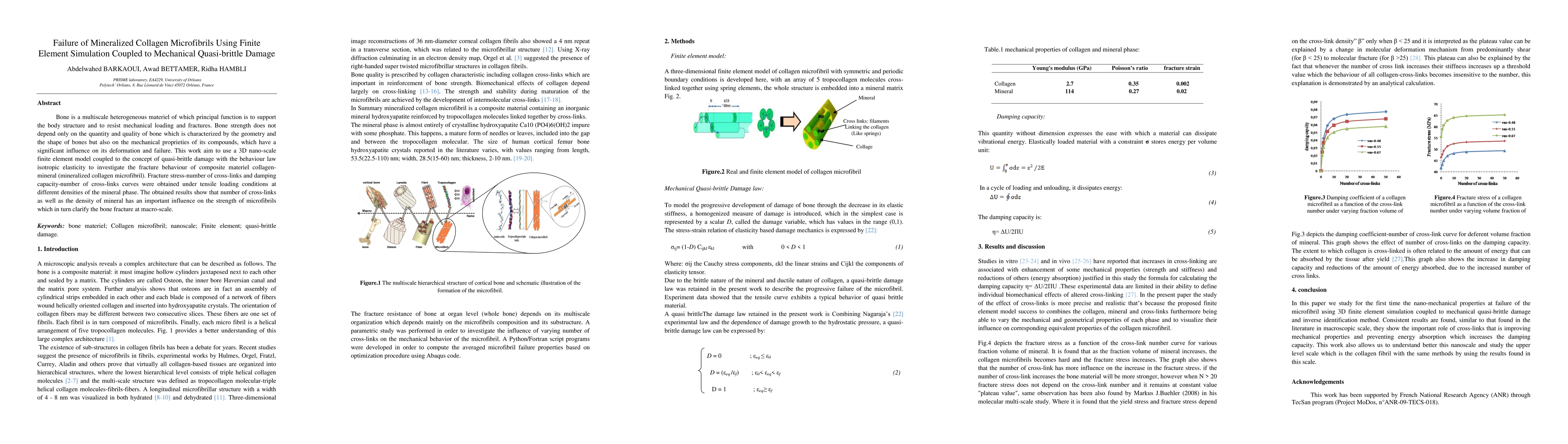 Bone is a multiscale heterogeneous materiel of which principal function is to support the body structure and to resist mechanical loading and fractures. Bone strength does not depend only on the quantity and quality of bone which is characterized by the geometry and the shape of bones but also on the mechanical proprieties of its compounds, which have a significant influence on its deformation and failure. This work aim to use a 3D nano-scale finite element model coupled to the concept of quasi-brittle damage with the behaviour law isotropic elasticity to investigate the fracture behaviour of composite materiel collagen-mineral (mineralized collagen microfibril). Fracture stress-number of cross-links and damping capacity-number of cross-links curves were obtained under tensile loading conditions at different densities of the mineral phase. The obtained results show that number of cross-links as well as the density of mineral has an important influence on the strength of microfibrils which in turn clarify the bone fracture at macro-scale.