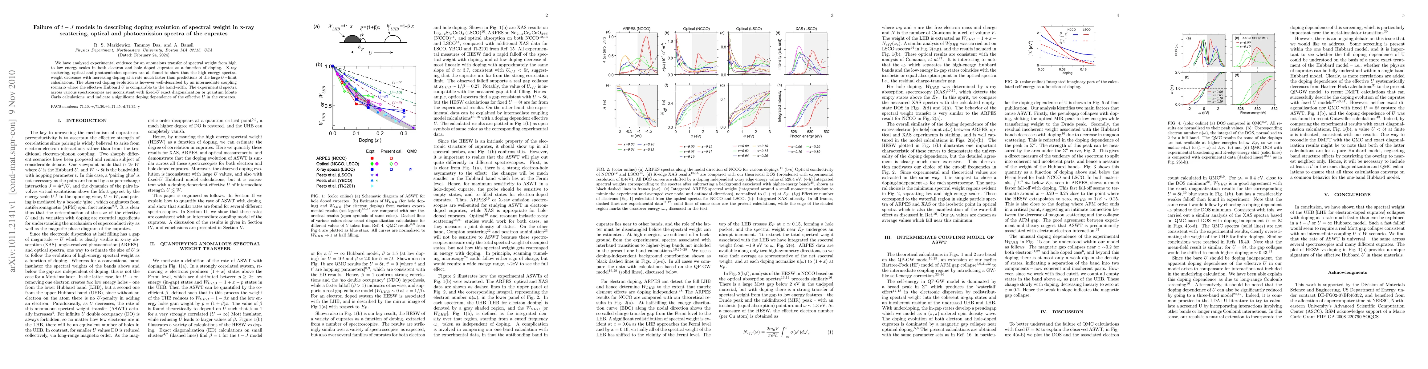 This paper finds that t-J models fail to describe the anomalous transfer of spectral weight in cuprates with varying doping levels, as observed in x-ray scattering, optical, and photoemission spectra. Instead, an intermediate coupling scenario with a doping-dependent effective Hubbard $U$ provides a better fit.