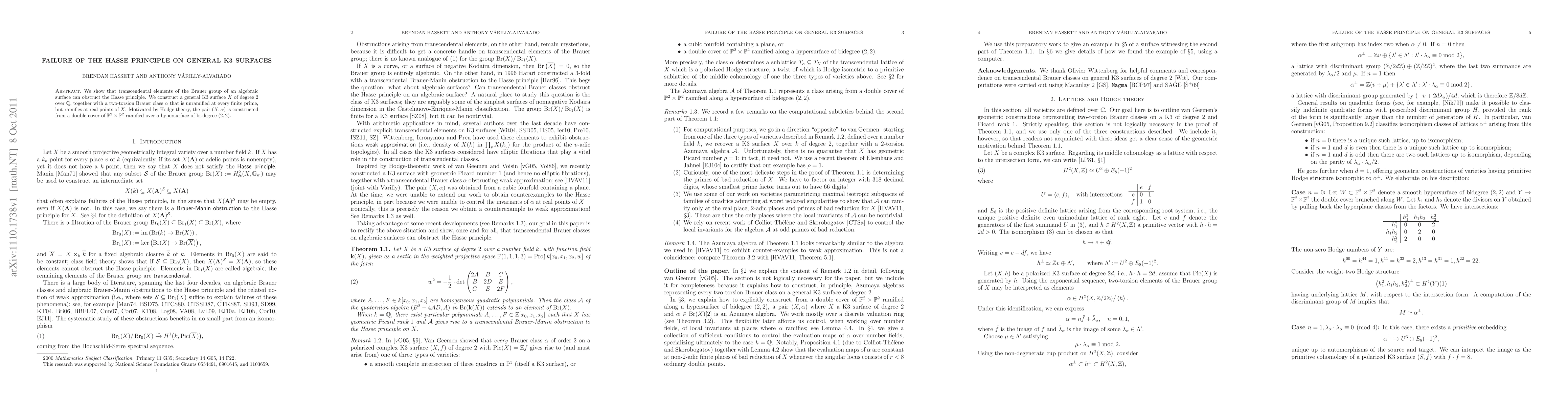 Summary: The paper demonstrates that transcendental Brauer group elements can disrupt the Hasse principle for K3 surfaces. It constructs a general K3 surface with a two-torsion Brauer class that remains unramified at finite primes but ramifies at real points, illustrating the obstruction via Hodge theory.