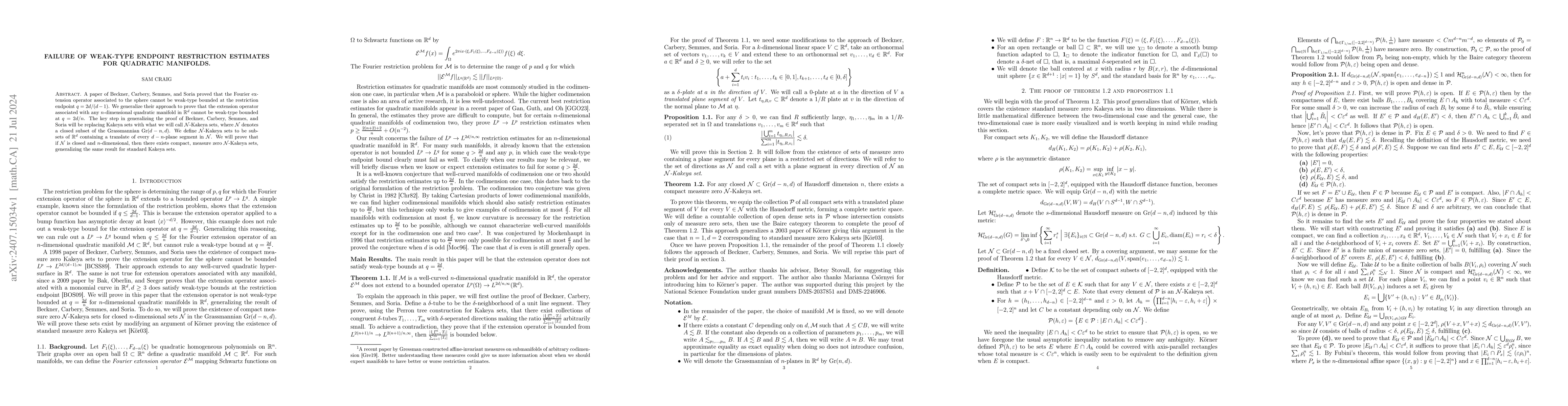 This paper generalizes Beckner et al.'s result showing the failure of weak-type endpoint restriction estimates for the Fourier extension operator associated with the sphere to any $n$-dimensional quadratic manifold in $\mathbb{R}^d$. It introduces $\mathcal{N}$-Kakeya sets to replace Kakeya sets, proving the existence of compact, measure zero $\mathcal{N}$-Kakeya sets under certain conditions.