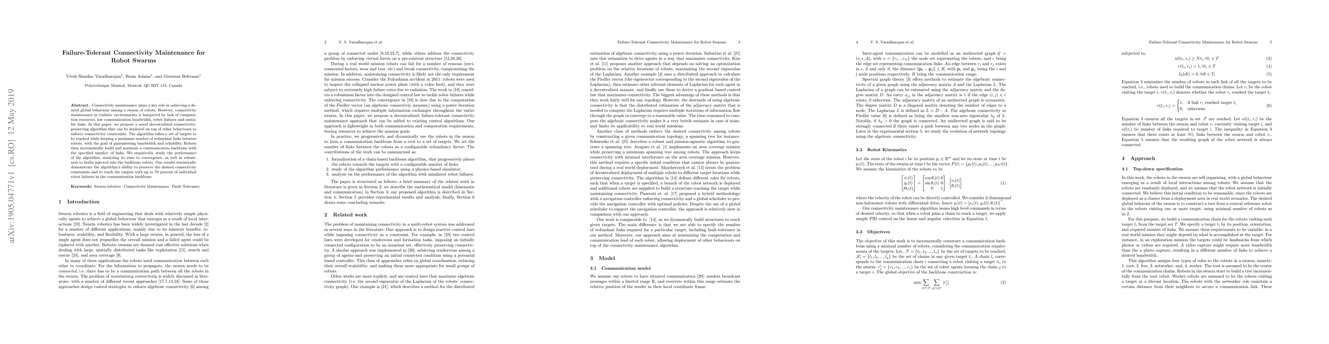 This paper proposes a decentralized algorithm for maintaining connectivity in robot swarms, ensuring communication backbone robustness despite failures. The algorithm achieves this by incrementally building and preserving a minimum number of redundant links, demonstrating strong performance under high failure rates.