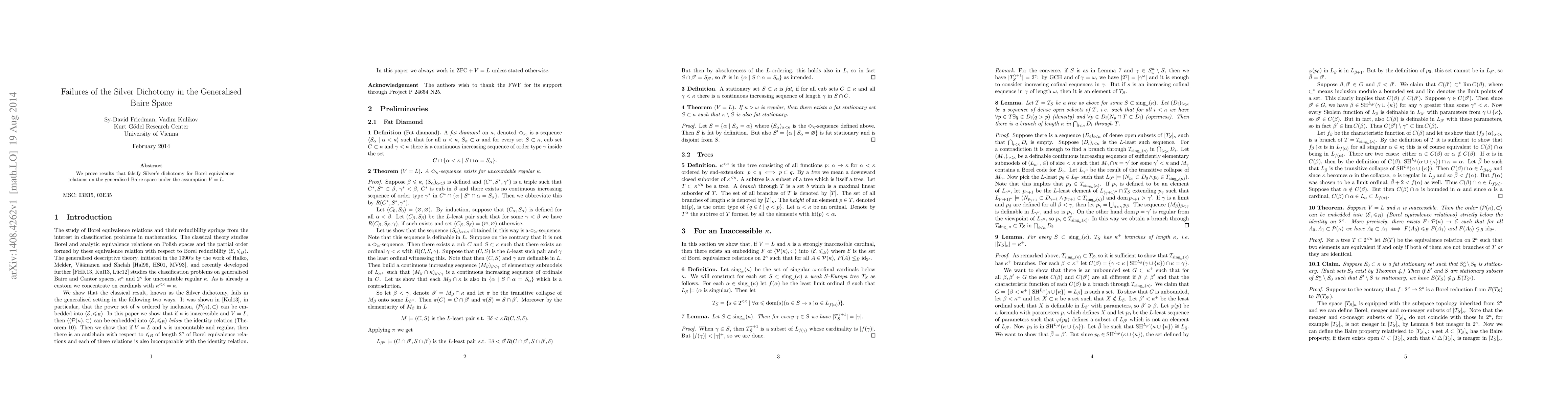 Summary: This paper disproves Silver's dichotomy for Borel equivalence relations on the generalised Baire space when assuming V=L, revealing failures in the previously held conjecture. The findings challenge established theories in descriptive set theory.