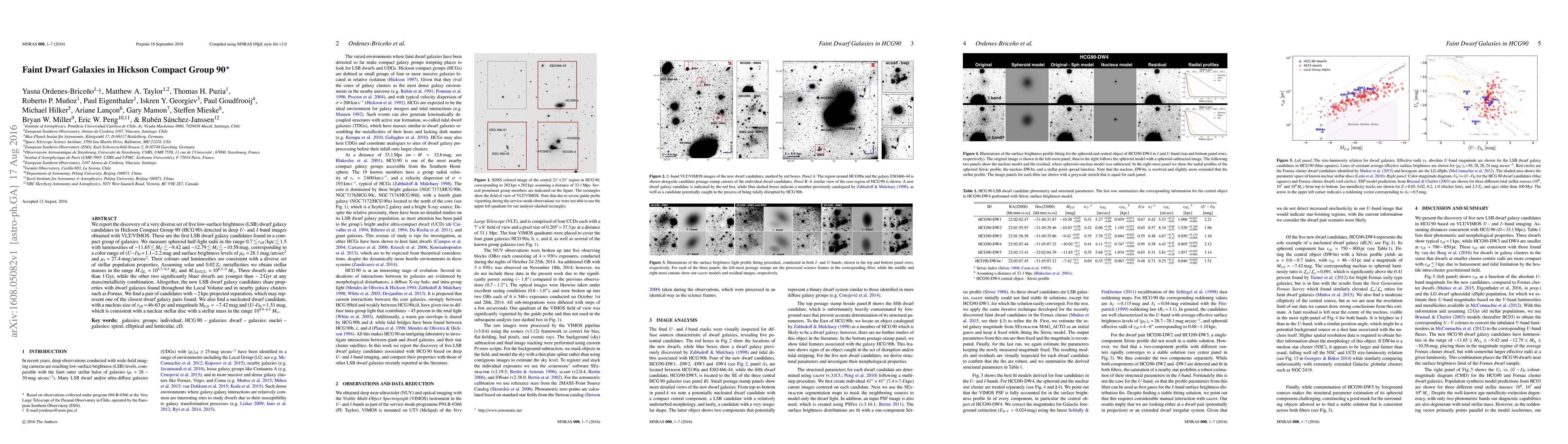 The paper reports the discovery of five low-surface brightness dwarf galaxy candidates in Hickson Compact Group 90, characterized by diverse stellar populations and ages ranging from older than 1 Gyr to less than 2 Gyr. The galaxies exhibit a range of luminosities and colors, suggesting varied stellar masses and metallicities.