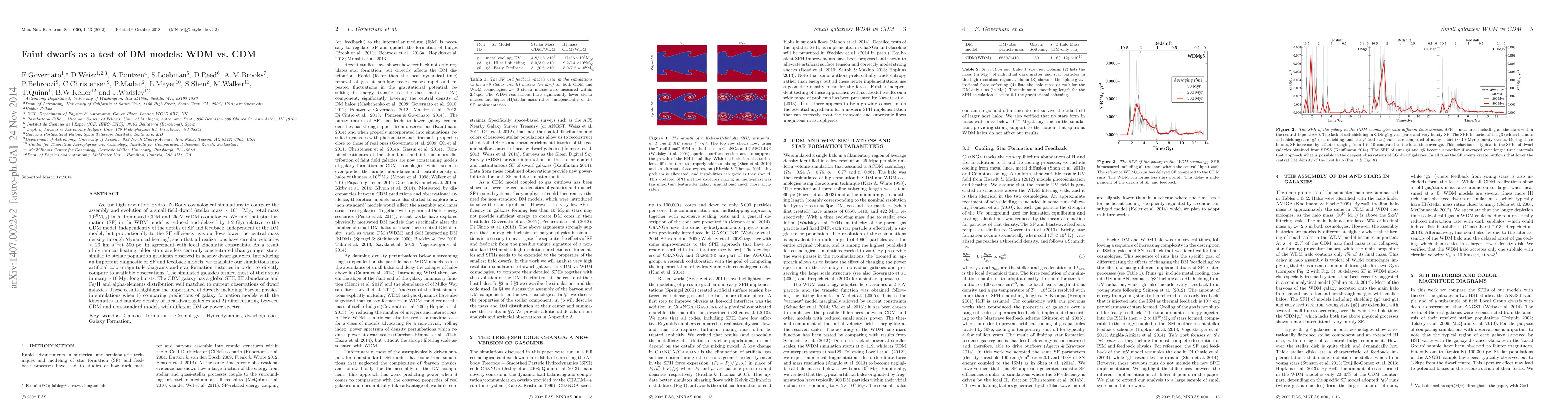 We use high resolution Hydro$+$N-Body cosmological simulations to compare the assembly and evolution of a small field dwarf (stellar mass ~ 10$^{6-7}$ M$\odot$, total mass 10$^{10}$ M$\odot$ in $\Lambda$ dominated CDM and 2keV WDM cosmologies. We find that star formation (SF) in the WDM model is reduced and delayed by 1-2 Gyr relative to the CDM model, independently of the details of SF and feedback. Independent of the DM model, but proportionally to the SF efficiency, gas outflows lower the central mass density through `dynamical heating', such that all realizations have circular velocities $<$ 20kms at 500$~$pc, in agreement with local kinematic constraints. As a result of dynamical heating, older stars are less centrally concentrated than younger stars, similar to stellar population gradients observed in nearby dwarf galaxies. Introducing an important diagnostic of SF and feedback models, we translate our simulations into artificial color-magnitude diagrams and star formation histories in order to directly compare to available observations. The simulated galaxies formed most of their stars in many $\sim$10 Myr long bursts. The CDM galaxy has a global SFH, HI abundance and Fe/H and alpha-elements distribution well matched to current observations of dwarf galaxies. These results highlight the importance of directly including `baryon physics' in simulations when 1) comparing predictions of galaxy formation models with the kinematics and number density of local dwarf galaxies and 2) differentiating between CDM and non-standard models with different DM or power spectra.