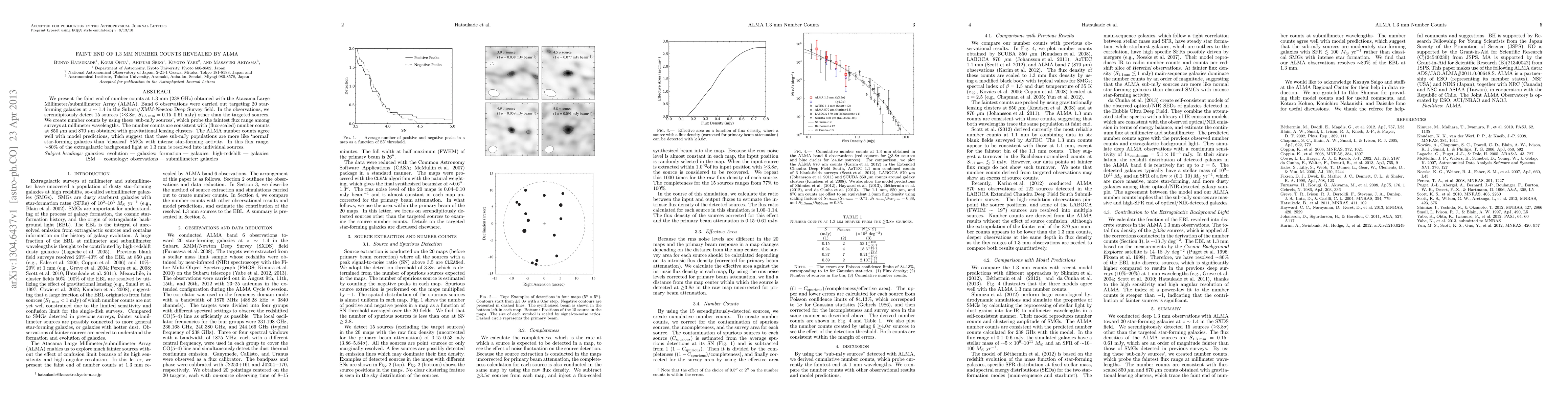 This paper presents ALMA observations revealing faint number counts at 1.3 mm, detecting 15 serendipitous sources among 20 targeted star-forming galaxies. The results suggest these faint sources represent typical star-forming galaxies rather than intense starbursts, contributing significantly to the extragalactic background light at 1.3 mm.