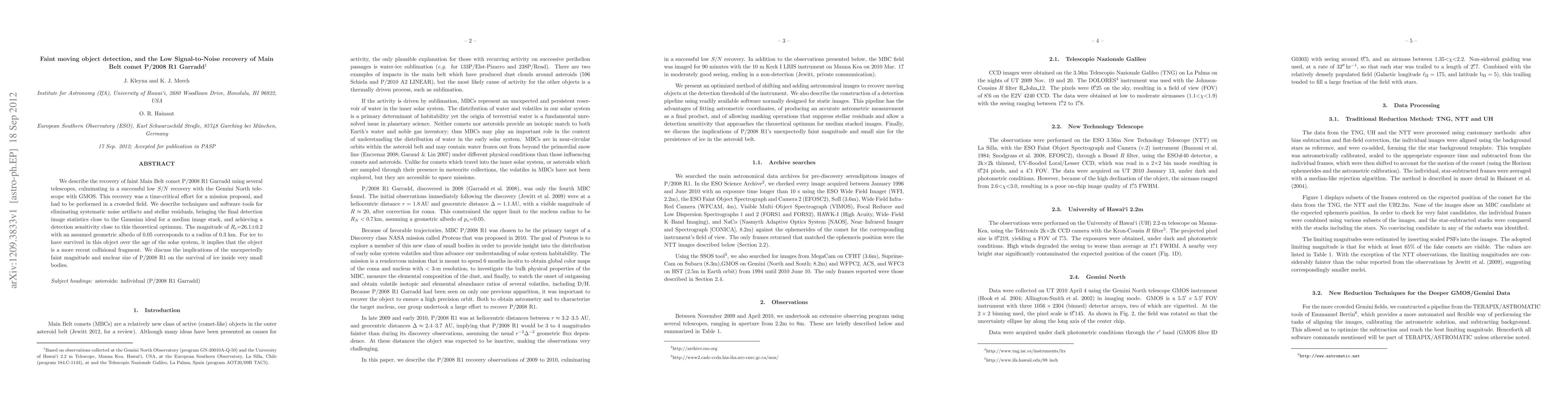 We describe the recovery of faint Main Belt comet P/2008 R1 Garradd using several telescopes, culminating in a successful low $S/N$ recovery with the Gemini North telescope with GMOS. This recovery was a time-critical effort for a mission proposal, and had to be performed in a crowded field. We describe techniques and software tools for eliminating systematic noise artifacts and stellar residuals, bringing the final detection image statistics close to the Gaussian ideal for a median image stack, and achieving a detection sensitivity close to this theoretical optimum. The magnitude of $R_c$=26.1$\pm$0.2 with an assumed geometric albedo of 0.05 corresponds to a radius of 0.3 km. For ice to have survived in this object over the age of the solar system, it implies that the object is a more recent collisional fragment. We discuss the implications of the unexpectedly faint magnitude and nuclear size of P/2008 R1 on the survival of ice inside very small bodies.
