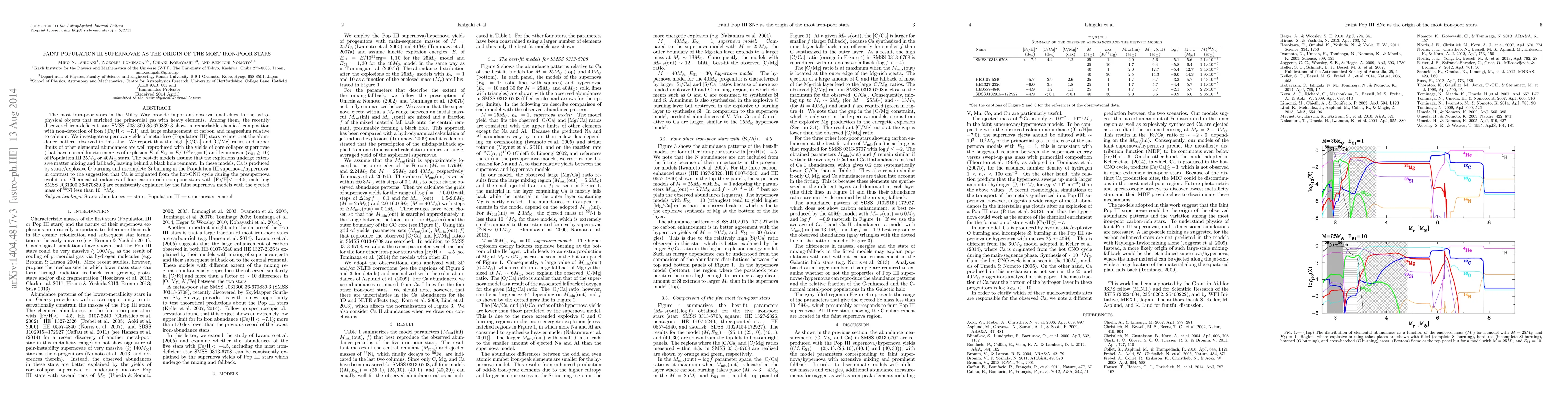 This paper explores the supernova yields of Population III stars to explain the chemical composition of the most iron-poor stars in the Milky Way, particularly SMSS J031300.36-670839.3. The study finds that core-collapse supernovae or hypernovae from 25$M_{\odot}$ or 40$M_{\odot}$ Population III stars can reproduce the observed high carbon-to-calcium and carbon-to-magnesium ratios, suggesting these faint supernovae as the origin of the iron-poor stars.