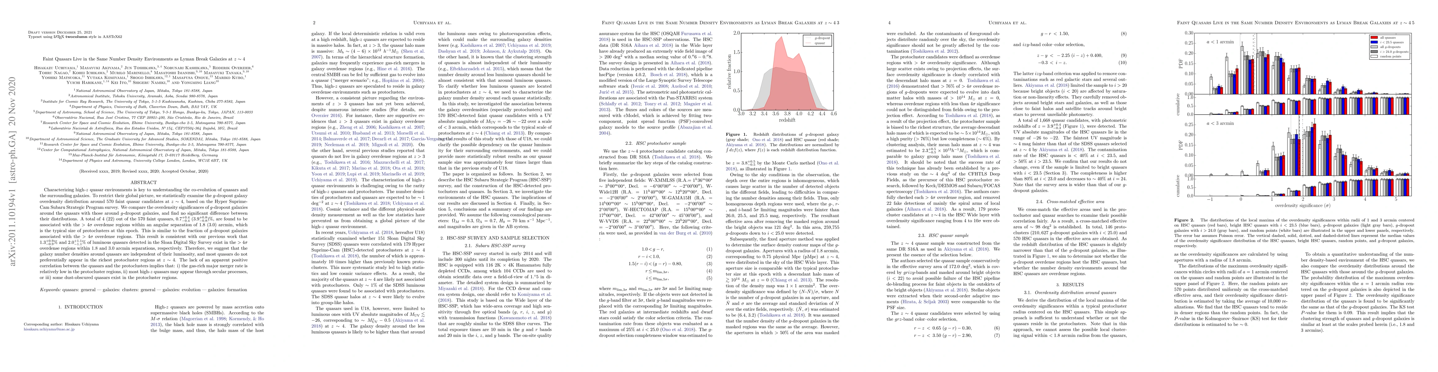 This study finds that faint quasars at z ~ 4 inhabit environments with similar galaxy number densities as Lyman break galaxies, suggesting no significant preference for quasars to reside in the densest protocluster regions. The results imply low gas-rich merger rates in protoclusters and suggest that high-z quasars likely emerge through secular processes or are dust-obscured.