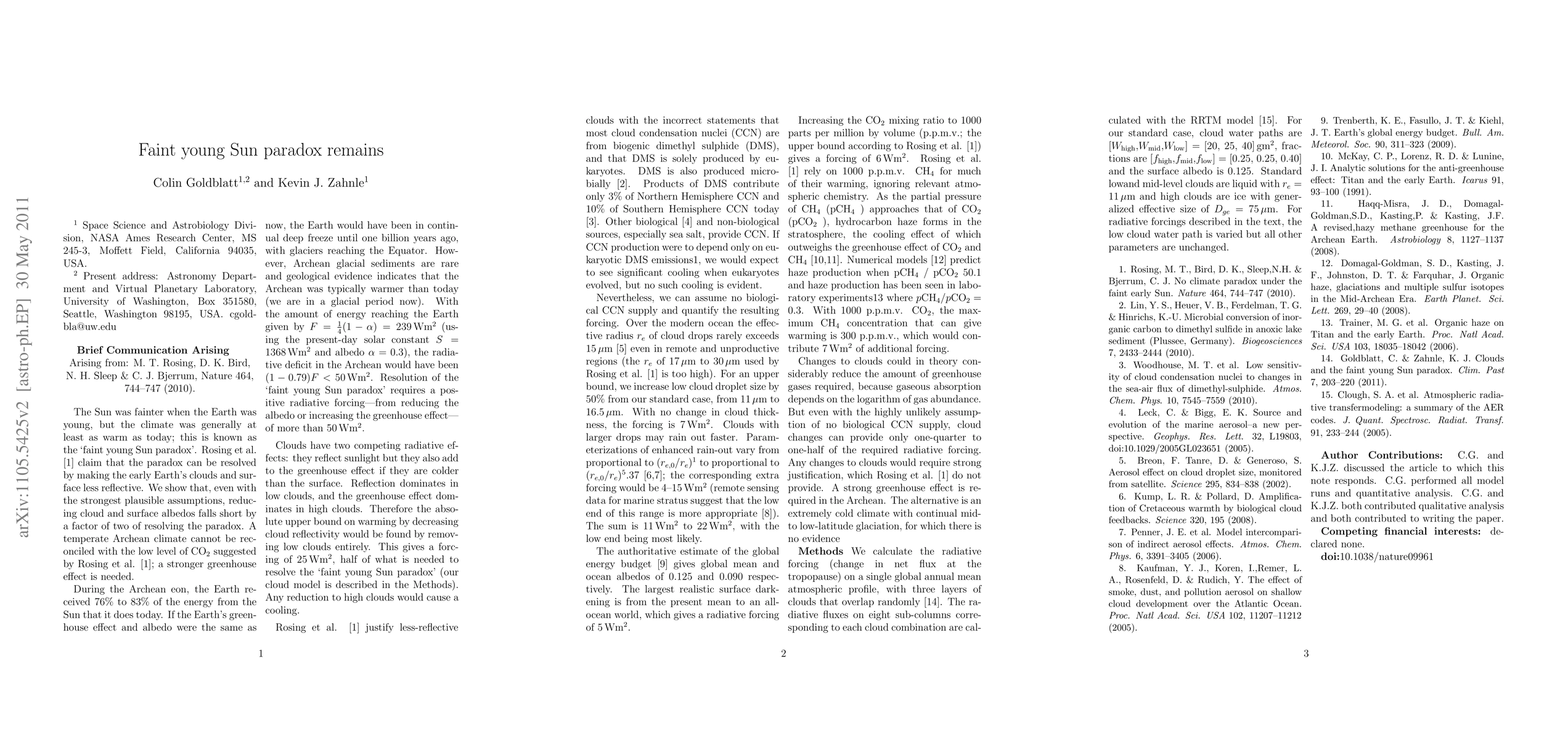 The Sun was fainter when the Earth was young, but the climate was generally at least as warm as today; this is known as the `faint young Sun paradox'. Rosing et al. [1] claim that the paradox can be resolved by making the early Earth's clouds and surface less reflective. We show that, even with the strongest plausible assumptions, reducing cloud and surface albedos falls short by a factor of two of resolving the paradox. A temperate Archean climate cannot be reconciled with the low level of CO2 suggested by Rosing et al. [1]; a stronger greenhouse effect is needed.