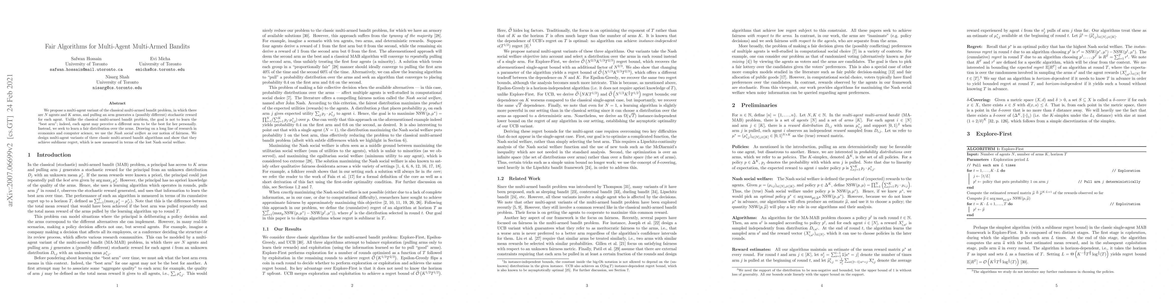 This paper introduces a multi-agent version of the multi-armed bandit problem where each agent seeks a fair distribution of rewards over arms, measured by Nash social welfare. It proposes three algorithms achieving sublinear regret in terms of lost welfare, addressing the challenge of differing individual perceptions of the "best arm."