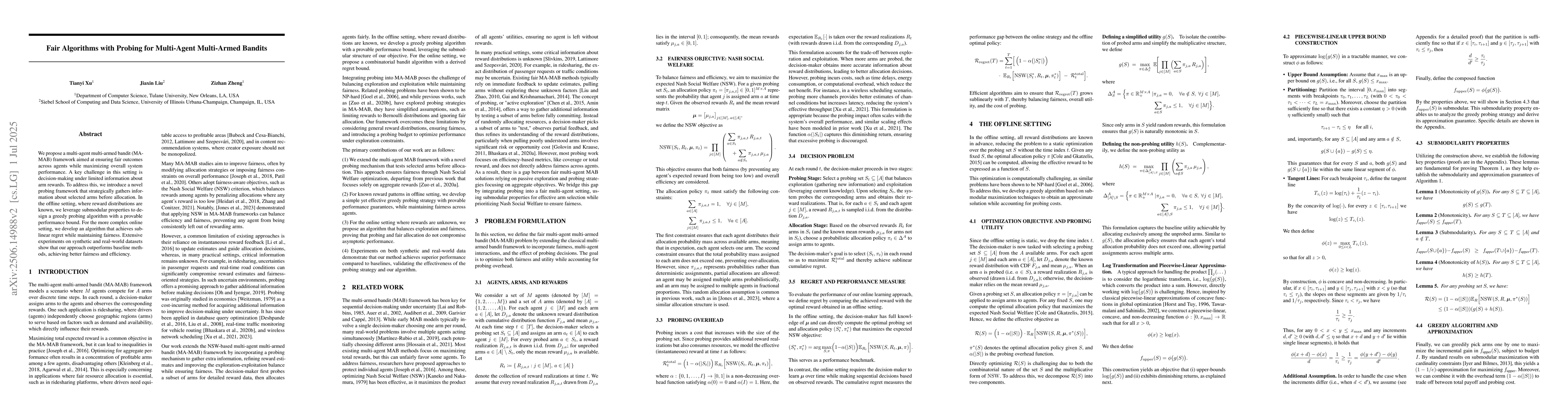 We propose a multi-agent multi-armed bandit (MA-MAB) framework aimed at ensuring fair outcomes across agents while maximizing overall system performance. A key challenge in this setting is decision-making under limited information about arm rewards. To address this, we introduce a novel probing framework that strategically gathers information about selected arms before allocation. In the offline setting, where reward distributions are known, we leverage submodular properties to design a greedy probing algorithm with a provable performance bound. For the more complex online setting, we develop an algorithm that achieves sublinear regret while maintaining fairness. Extensive experiments on synthetic and real-world datasets show that our approach outperforms baseline methods, achieving better fairness and efficiency.