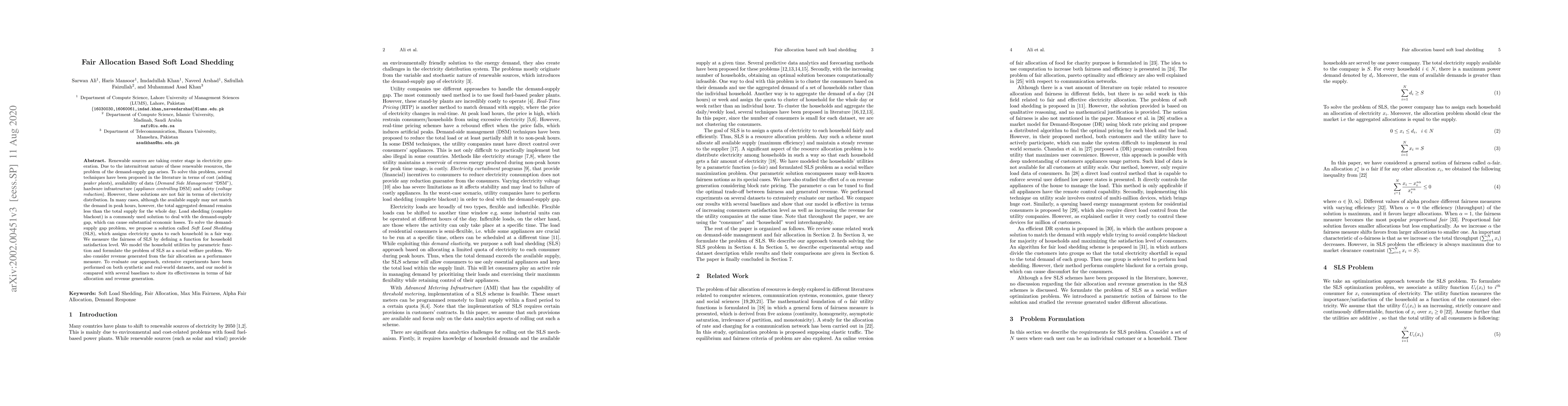 Renewable sources are taking center stage in electricity generation. Due to the intermittent nature of these renewable resources, the problem of the demand-supply gap arises. To solve this problem, several techniques have been proposed in the literature in terms of cost (adding peaker plants), availability of data (Demand Side Management "DSM"), hardware infrastructure (appliance controlling DSM) and safety (voltage reduction). However, these solutions are not fair in terms of electricity distribution. In many cases, although the available supply may not match the demand in peak hours, however, the total aggregated demand remains less than the total supply for the whole day. Load shedding (complete blackout) is a commonly used solution to deal with the demand-supply gap, which can cause substantial economic losses. To solve the demand-supply gap problem, we propose a solution called Soft Load Shedding (SLS), which assigns electricity quota to each household in a fair way. We measure the fairness of SLS by defining a function for household satisfaction level. We model the household utilities by parametric function and formulate the problem of SLS as a social welfare problem. We also consider revenue generated from the fair allocation as a performance measure. To evaluate our approach, extensive experiments have been performed on both synthetic and real-world datasets, and our model is compared with several baselines to show its effectiveness in terms of fair allocation and revenue generation.