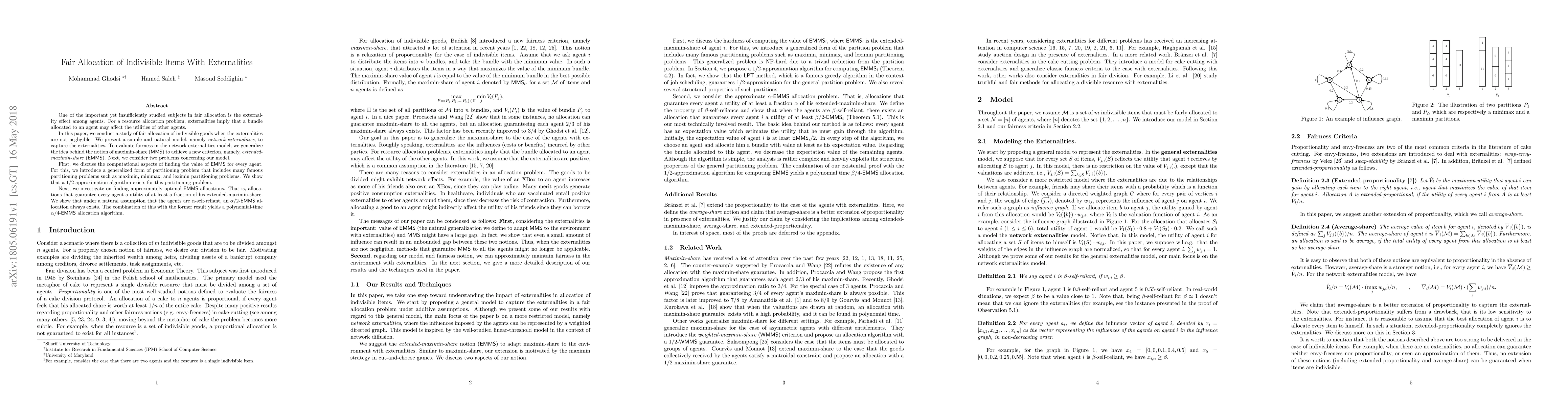 The paper proposes a model of network externalities for fair allocation of indivisible goods, introducing the concept of extended-maximin-share (EMMS) to evaluate fairness. It presents a 1/2-approximation algorithm for computing EMMS and proves the existence of an α/2-EMMS allocation for α-self-reliant agents.