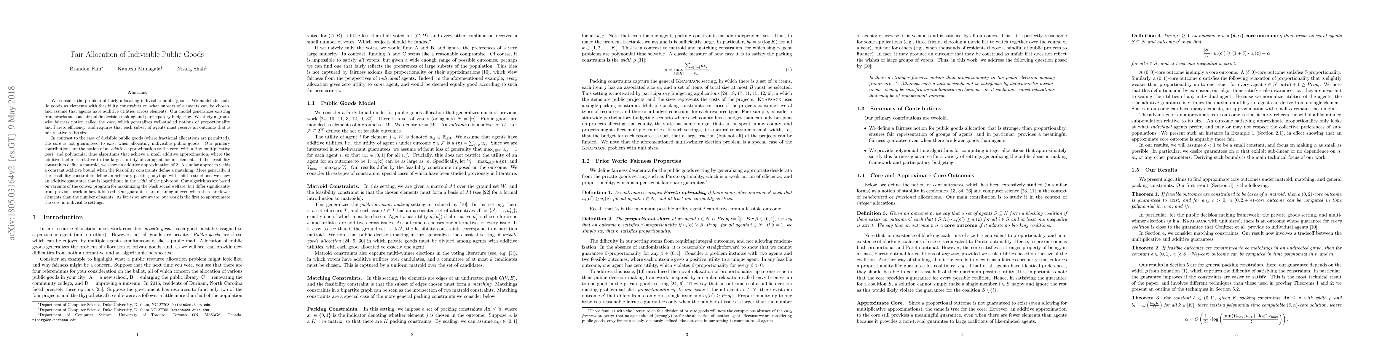 We consider the problem of fairly allocating indivisible public goods. We model the public goods as elements with feasibility constraints on what subsets of elements can be chosen, and assume that agents have additive utilities across elements. Our model generalizes existing frameworks such as fair public decision making and participatory budgeting. We study a groupwise fairness notion called the core, which generalizes well-studied notions of proportionality and Pareto efficiency, and requires that each subset of agents must receive an outcome that is fair relative to its size. In contrast to the case of divisible public goods (where fractional allocations are permitted), the core is not guaranteed to exist when allocating indivisible public goods. Our primary contributions are the notion of an additive approximation to the core (with a tiny multiplicative loss), and polynomial time algorithms that achieve a small additive approximation, where the additive factor is relative to the largest utility of an agent for an element. If the feasibility constraints define a matroid, we show an additive approximation of 2. A similar approach yields a constant additive bound when the feasibility constraints define a matching. More generally, if the feasibility constraints define an arbitrary packing polytope with mild restrictions, we show an additive guarantee that is logarithmic in the width of the polytope. Our algorithms are based on variants of the convex program for maximizing the Nash social welfare, but differ significantly from previous work in how it is used. Our guarantees are meaningful even when there are fewer elements than the number of agents. As far as we are aware, our work is the first to approximate the core in indivisible settings.
