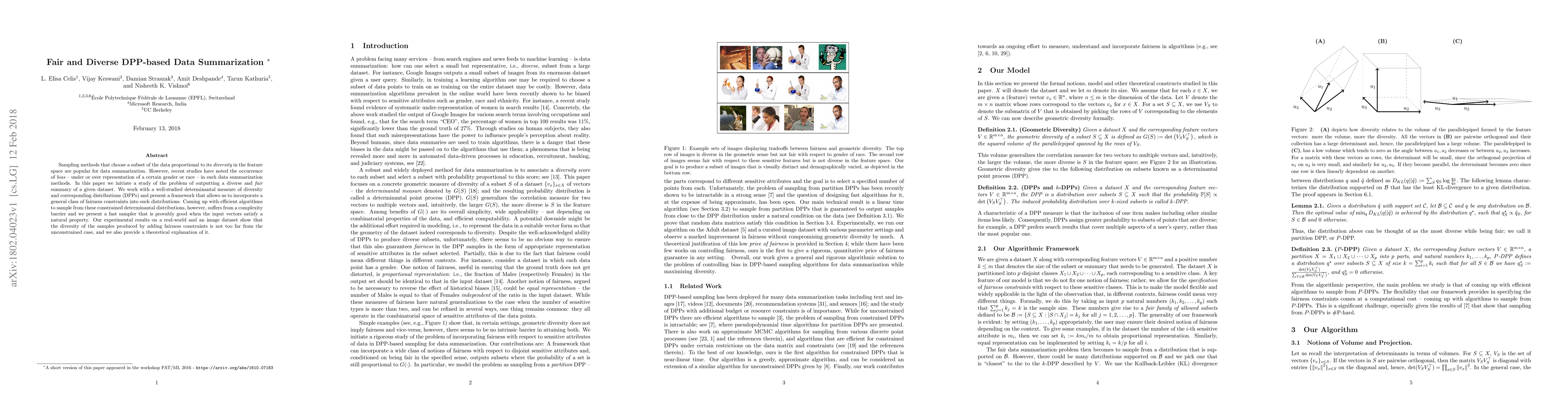 This paper presents a framework for fair and diverse data summarization using determinantal measure of diversity and corresponding distributions. It provides a fast sampler that is provably good when input vectors satisfy a natural property, improving diversity while maintaining fairness.
