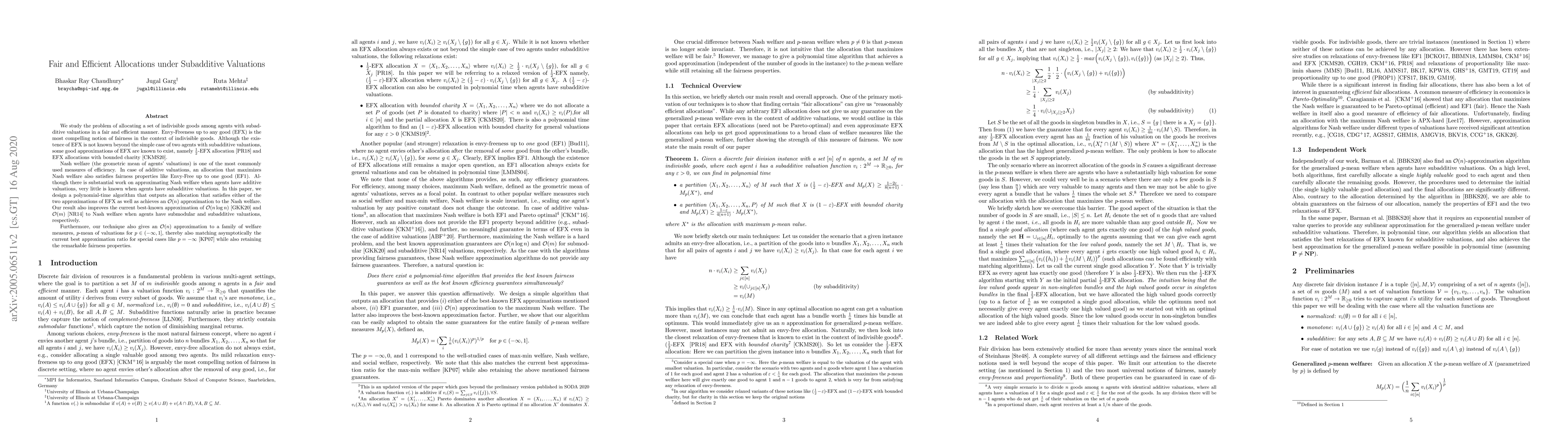 We study the problem of allocating a set of indivisible goods among agents with subadditive valuations in a fair and efficient manner. Envy-Freeness up to any good (EFX) is the most compelling notion of fairness in the context of indivisible goods. Although the existence of EFX is not known beyond the simple case of two agents with subadditive valuations, some good approximations of EFX are known to exist, namely $\tfrac{1}{2}$-EFX allocation and EFX allocations with bounded charity. Nash welfare (the geometric mean of agents' valuations) is one of the most commonly used measures of efficiency. In case of additive valuations, an allocation that maximizes Nash welfare also satisfies fairness properties like Envy-Free up to one good (EF1). Although there is substantial work on approximating Nash welfare when agents have additive valuations, very little is known when agents have subadditive valuations. In this paper, we design a polynomial-time algorithm that outputs an allocation that satisfies either of the two approximations of EFX as well as achieves an $\mathcal{O}(n)$ approximation to the Nash welfare. Our result also improves the current best-known approximation of $\mathcal{O}(n \log n)$ and $\mathcal{O}(m)$ to Nash welfare when agents have submodular and subadditive valuations, respectively. Furthermore, our technique also gives an $\mathcal{O}(n)$ approximation to a family of welfare measures, $p$-mean of valuations for $p\in (-\infty, 1]$, thereby also matching asymptotically the current best known approximation ratio for special cases like $p =-\infty$ while also retaining the fairness properties.