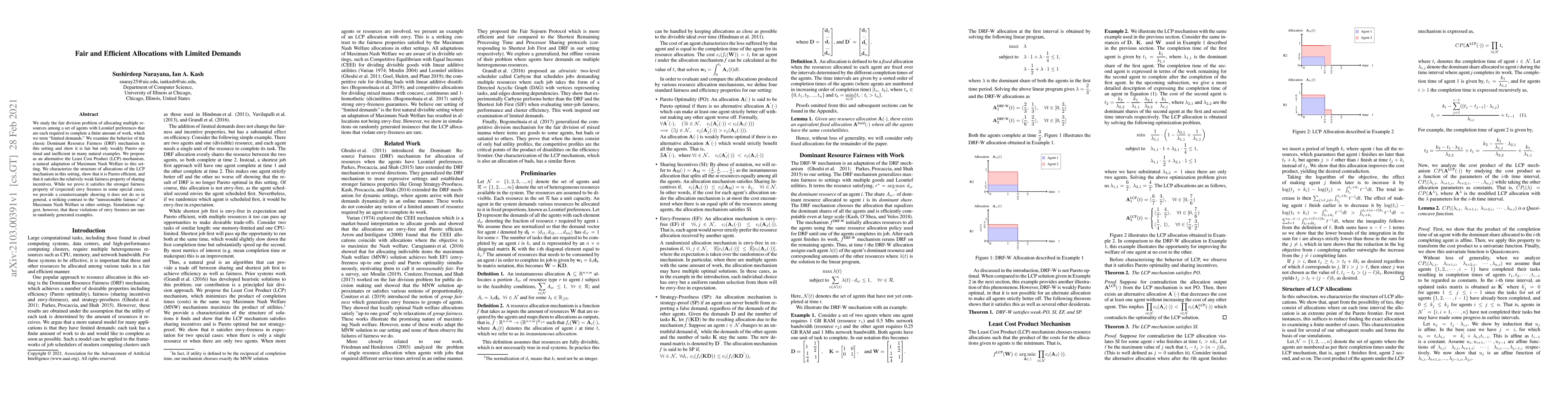 This paper investigates fair allocation of resources to agents with limited demands under Leontief preferences, finding that the Dominant Resource Fairness mechanism is fair but inefficient. It proposes the Least Cost Product mechanism as an alternative, which is Pareto efficient and satisfies sharing incentives, though it does not generally achieve envy freeness, though simulations suggest such violations are rare.