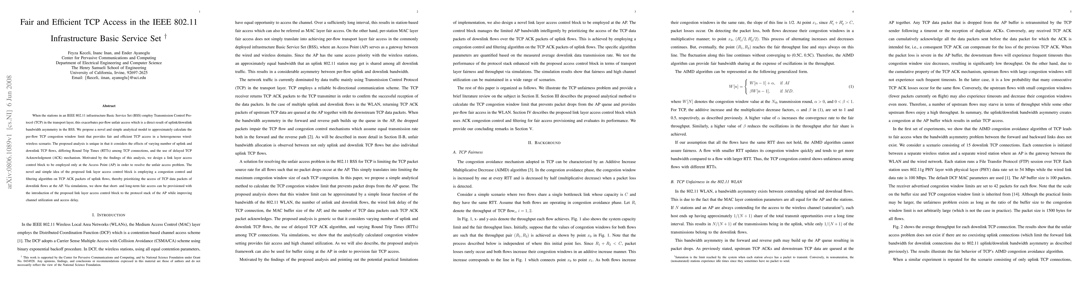 This paper proposes an analytical model to calculate fair TCP congestion window limits in IEEE 802.11 BSSs, addressing per-flow unfair access due to bandwidth asymmetry. It also introduces a link layer access control block at the Access Point to prioritize downlink TCP data packets, achieving short- and long-term fair access, improved channel utilization, and reduced access delay.