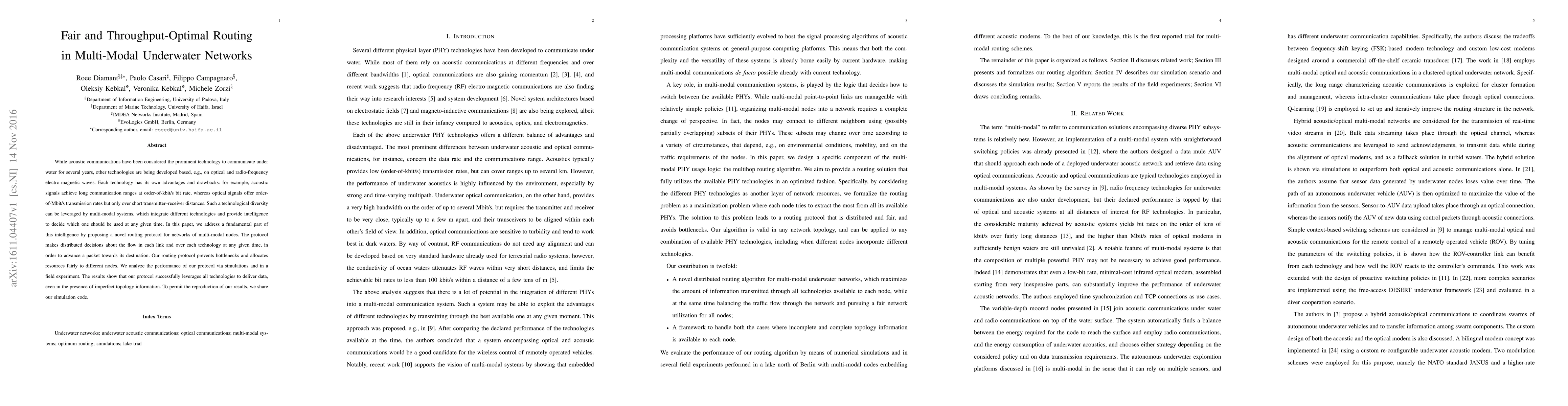 While acoustic communications have been considered the prominent technology to communicate under water for several years, other technologies are being developed based, e.g., on optical and radio-frequency electro-magnetic waves. Each technology has its own advantages and drawbacks: for example, acoustic signals achieve long communication ranges at order-of-kbit/s bit rate, whereas optical signals offer order-of-Mbit/s transmission rates but only over short transmitter--receiver distances. Such a technological diversity can be leveraged by multi-modal systems, which integrate different technologies and provide intelligence to decide which one should be used at any given time. In this paper, we address a fundamental part of this intelligence by proposing a novel routing protocol for networks of multi-modal nodes. The protocol makes distributed decisions about the flow in each link and over each technology at any given time, in order to advance a packet towards its destination. Our routing protocol prevents bottlenecks and allocates resources fairly to different nodes. We analyze the performance of our protocol via simulations and in a field experiment. The results show that our protocol successfully leverages all technologies to deliver data, even in the presence of imperfect topology information. To permit the reproduction of our results, we share our simulation code.