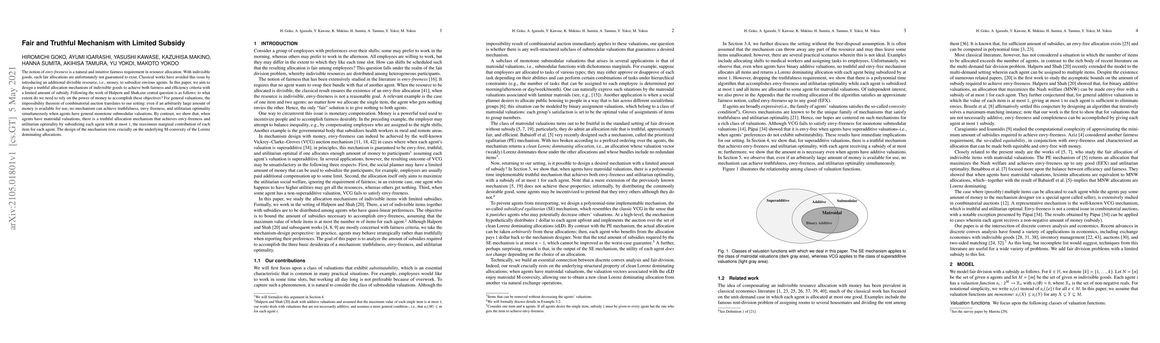 The work is novel in demonstrating that envy-freeness, truthfulness, and utilitarian optimality can be achieved with subsidies capped at 1 for matroidal valuations, and in providing a polynomial-time algorithm for this purpose.