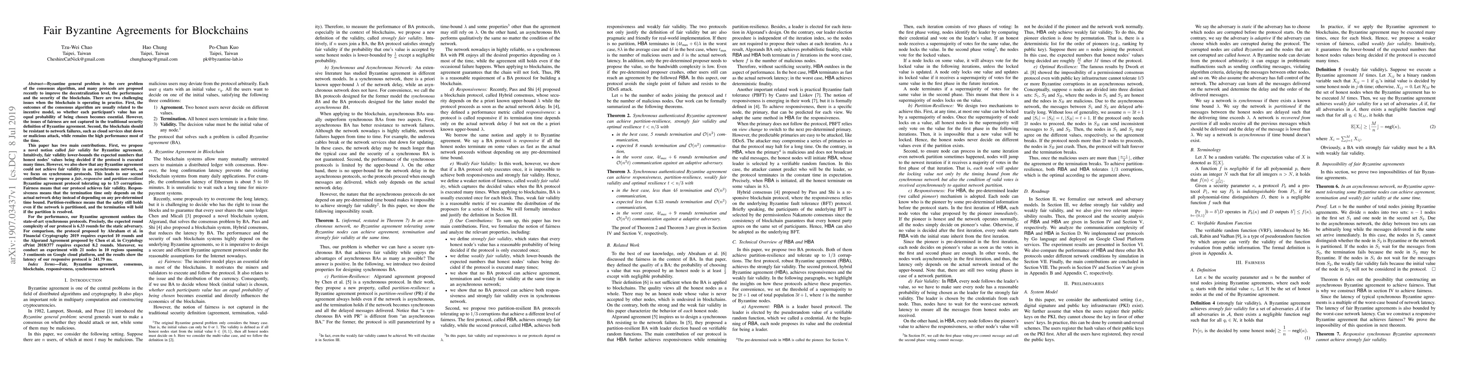 Byzantine general problem is the core problem of the consensus algorithm, and many protocols are proposed recently to improve the decentralization level, the performance and the security of the blockchain. There are two challenging issues when the blockchain is operating in practice. First, the outcomes of the consensus algorithm are usually related to the incentive model, so whether each participant's value has an equal probability of being chosen becomes essential. However, the issues of fairness are not captured in the traditional security definition of Byzantine agreement. Second, the blockchain should be resistant to network failures, such as cloud services shut down or malicious attack, while remains the high performance most of the time. This paper has two main contributions. First, we propose a novel notion called fair validity for Byzantine agreement. Intuitively, fair validity lower-bounds the expected numbers that honest nodes' values being decided if the protocol is executed many times. However, we also show that any Byzantine agreement could not achieve fair validity in an asynchronous network, so we focus on synchronous protocols. This leads to our second contribution: we propose a fair, responsive and partition-resilient Byzantine agreement protocol tolerating up to 1/3 corruptions. Fairness means that our protocol achieves fair validity. Responsiveness means that the termination time only depends on the actual network delay instead of depending on any pre-determined time bound. Partition-resilience means that the safety still holds even if the network is partitioned, and the termination will hold if the partition is resolved.