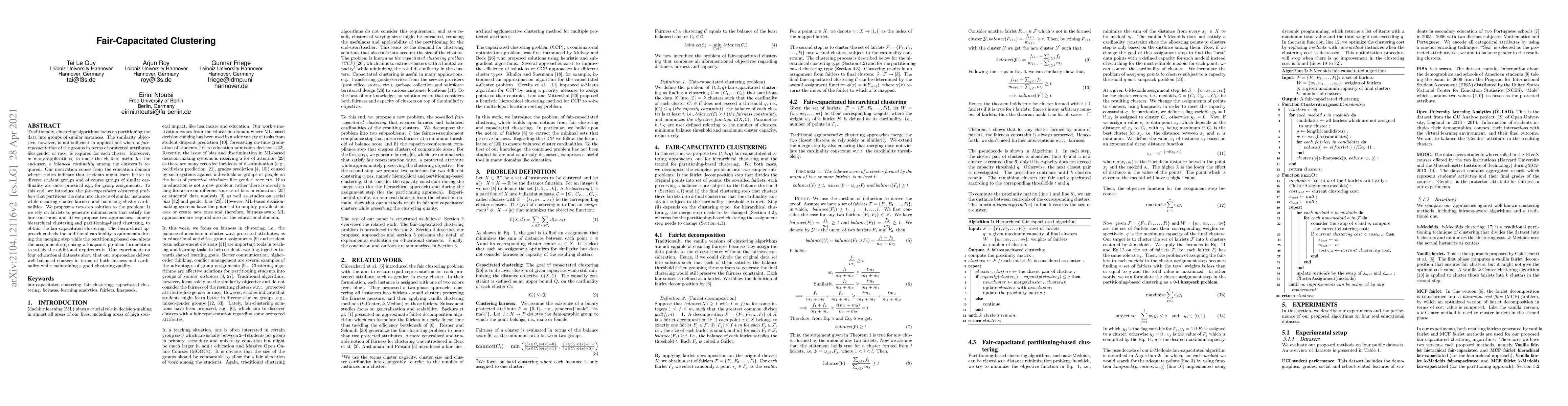 This paper introduces the fair-capacitated clustering problem, aiming to partition data into similar groups while ensuring fair representation of protected attributes and balanced cluster sizes. The proposed solution uses fairlets and two clustering methods, demonstrating effective balance in fairness and cardinality in educational datasets.