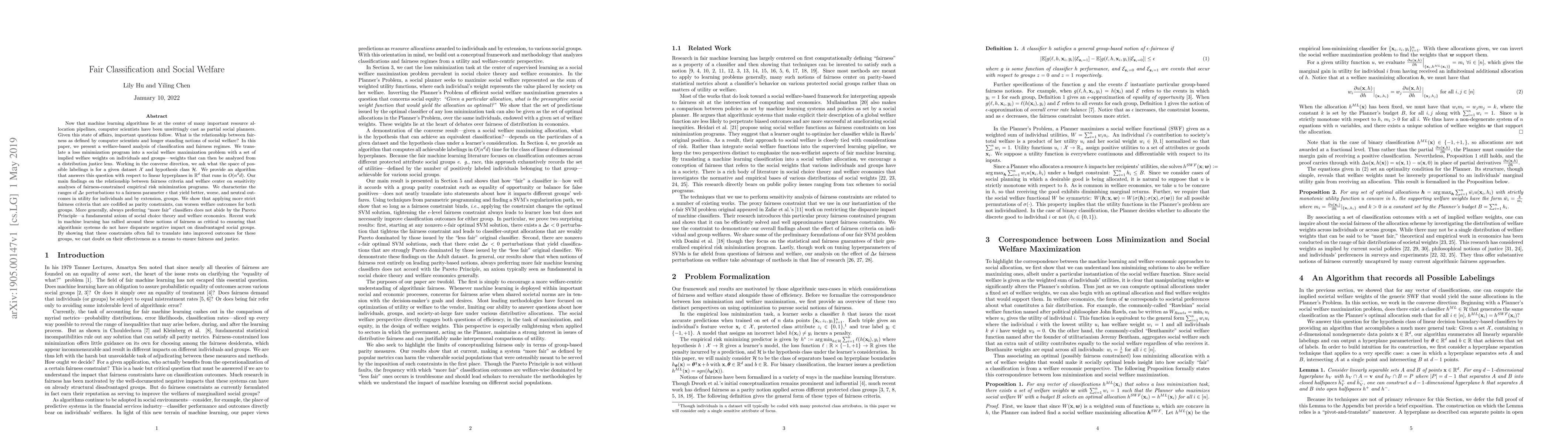 Now that machine learning algorithms lie at the center of many resource allocation pipelines, computer scientists have been unwittingly cast as partial social planners. Given this state of affairs, important questions follow. What is the relationship between fairness as defined by computer scientists and notions of social welfare? In this paper, we present a welfare-based analysis of classification and fairness regimes. We translate a loss minimization program into a social welfare maximization problem with a set of implied welfare weights on individuals and groups--weights that can be analyzed from a distribution justice lens. In the converse direction, we ask what the space of possible labelings is for a given dataset and hypothesis class. We provide an algorithm that answers this question with respect to linear hyperplanes in $\mathbb{R}^d$ that runs in $O(n^dd)$. Our main findings on the relationship between fairness criteria and welfare center on sensitivity analyses of fairness-constrained empirical risk minimization programs. We characterize the ranges of $\Delta \epsilon$ perturbations to a fairness parameter $\epsilon$ that yield better, worse, and neutral outcomes in utility for individuals and by extension, groups. We show that applying more strict fairness criteria that are codified as parity constraints, can worsen welfare outcomes for both groups. More generally, always preferring "more fair" classifiers does not abide by the Pareto Principle---a fundamental axiom of social choice theory and welfare economics. Recent work in machine learning has rallied around these notions of fairness as critical to ensuring that algorithmic systems do not have disparate negative impact on disadvantaged social groups. By showing that these constraints often fail to translate into improved outcomes for these groups, we cast doubt on their effectiveness as a means to ensure justice.
