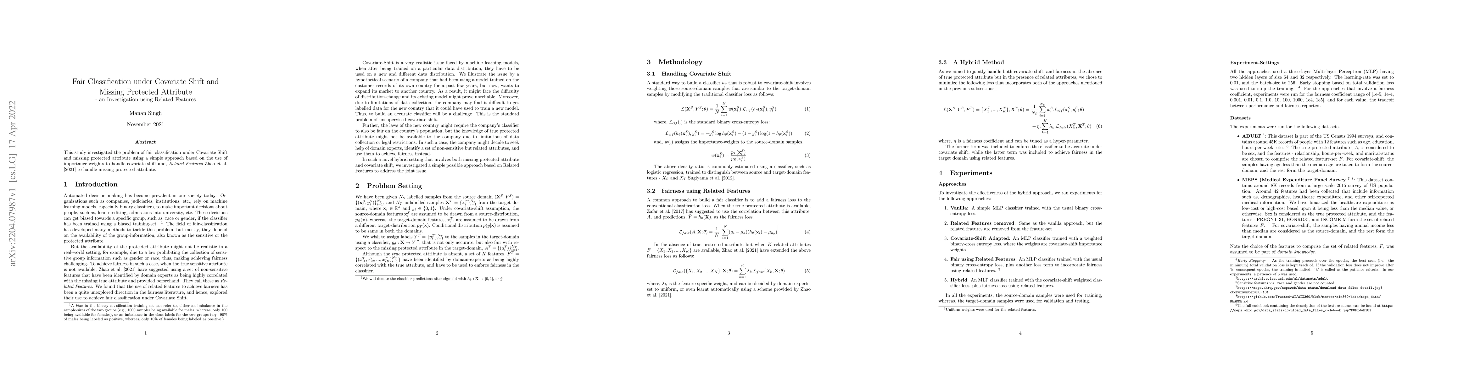 This study investigated the problem of fair classification under Covariate Shift and missing protected attribute using a simple approach based on the use of importance-weights to handle covariate-shift and, Related Features arXiv:2104.14537 to handle missing protected attribute.
