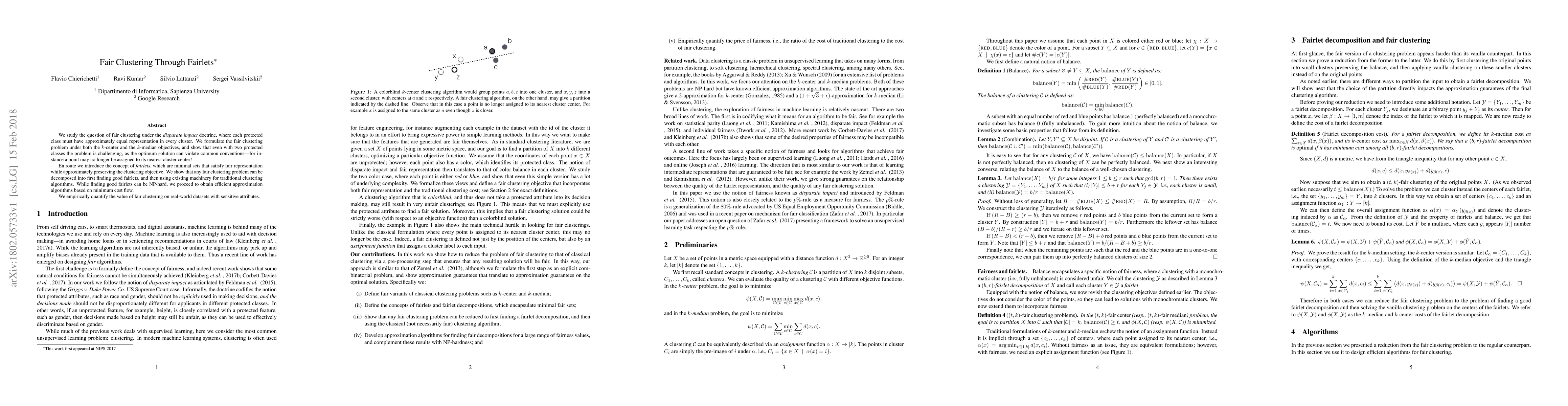 This paper tackles fair clustering under disparate impact, introducing the concept of fairlets—minimal sets ensuring fair representation within clusters. It presents challenges in achieving fair clustering under $k$-center and $k$-median objectives, and proposes efficient approximation algorithms based on minimum cost flow.