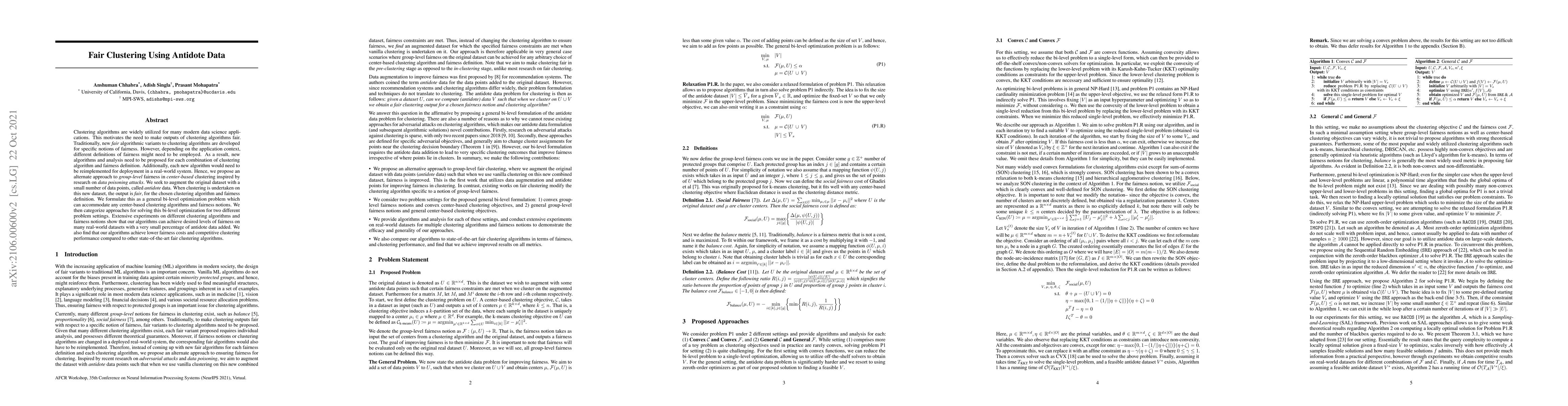 Clustering algorithms are widely utilized for many modern data science applications. This motivates the need to make outputs of clustering algorithms fair. Traditionally, new fair algorithmic variants to clustering algorithms are developed for specific notions of fairness. However, depending on the application context, different definitions of fairness might need to be employed. As a result, new algorithms and analysis need to be proposed for each combination of clustering algorithm and fairness definition. Additionally, each new algorithm would need to be reimplemented for deployment in a real-world system. Hence, we propose an alternate approach to group-level fairness in center-based clustering inspired by research on data poisoning attacks. We seek to augment the original dataset with a small number of data points, called antidote data. When clustering is undertaken on this new dataset, the output is fair, for the chosen clustering algorithm and fairness definition. We formulate this as a general bi-level optimization problem which can accommodate any center-based clustering algorithms and fairness notions. We then categorize approaches for solving this bi-level optimization for two different problem settings. Extensive experiments on different clustering algorithms and fairness notions show that our algorithms can achieve desired levels of fairness on many real-world datasets with a very small percentage of antidote data added. We also find that our algorithms achieve lower fairness costs and competitive clustering performance compared to other state-of-the-art fair clustering algorithms.