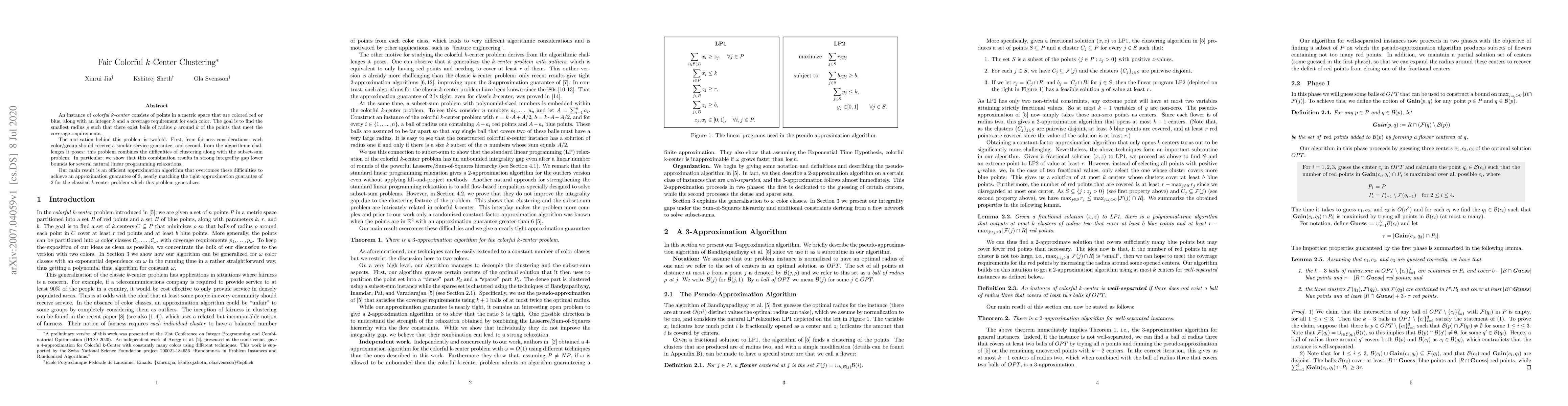 This paper addresses the colorful k-center clustering problem, aiming to find the smallest radius that ensures fair coverage for both red and blue points while meeting specific coverage requirements. The authors present an efficient approximation algorithm achieving a 3-approximation, nearly matching the 2-approximation guarantee of the classical k-center problem.